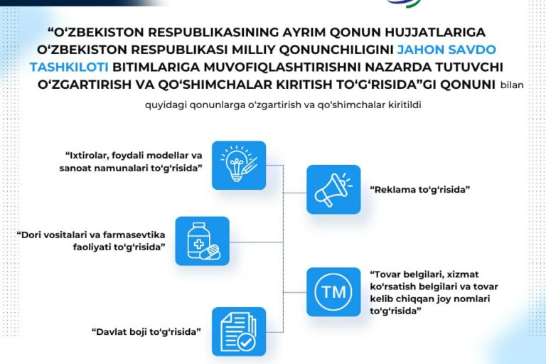 Mar272024 O‘zbekiston Respublikasi “O‘zbekiston Respublikasining ayrim qonun hujjatlariga O‘zbekiston Respublikasi milliy qonunchiligini Jahon savdo tashkiloti bitimlariga muvofiqlashtirishni nazarda tutuvchi o‘zgartirish va qo‘shimchalar kiritish to‘g‘risida”gi OʻRQ-908-son Qonuni