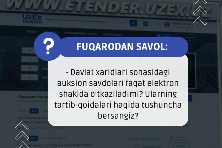 Yan192024 – Davlat xaridlari sohasidagi auksion savdolari faqat elektron shaklda o‘tkaziladimi? Ularning tartib-qoidalari haqida tushuncha bersangiz?