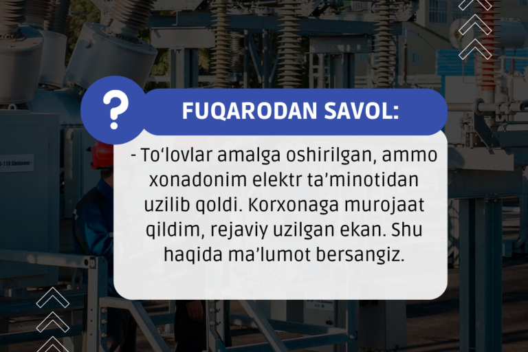 Yan232024 – To‘lovlar amalga oshirilgan, ammo xonadonim elektr ta’minotidan uzilib qoldi. Korxonaga murojaat qildim, rejaviy uzilgan ekan. Shu haqda ma’lumot bersangiz.