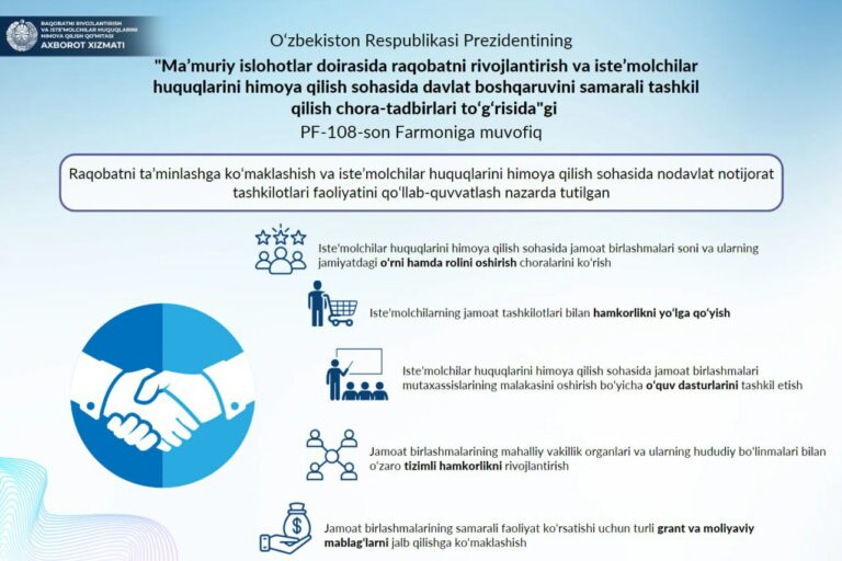 Iyul222023 «Ma’muriy islohotlar doirasida raqobatni rivojlantirish va iste’molchilar huquqlarini himoya qilish sohasida davlat boshqaruvini samarali tashkil qilish chora-tadbirlari to‘g‘risida»gi PF-108-son Prezident Farmoni qabul qilindi.