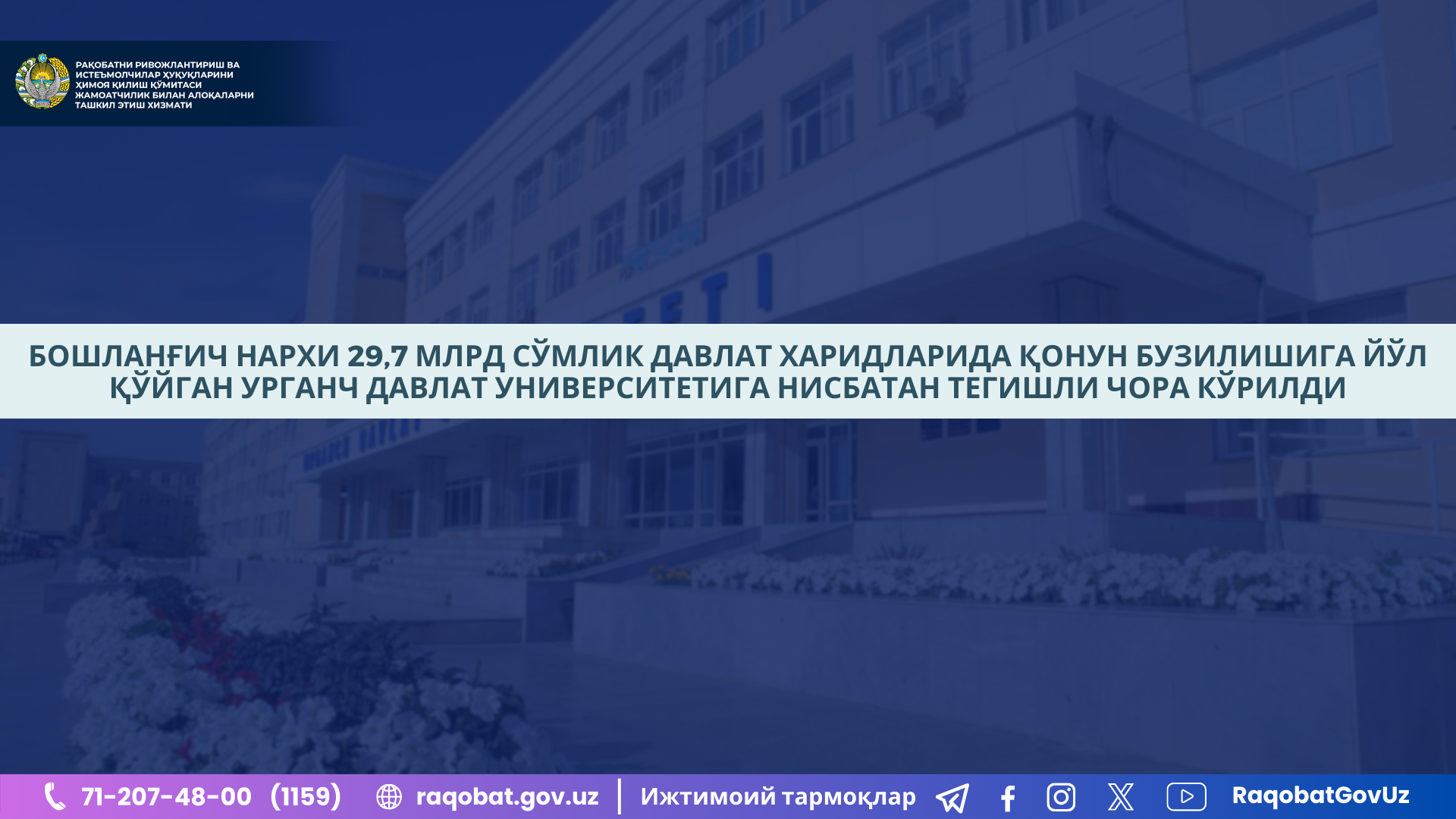 Yuqoridagilarga asosan, hududiy boshqarma Maxsus komissiyasi tomonidan Urganch davlat universitetiga nisbatan “Raqobat to‘g‘risida”gi Qonunning 29-moddasi talablari buzilishi yuzasidan belgilangan tartibda ish qo‘zg‘atilib, natijasi yuzasidan buyurtmachi tashkilot mansabdor shaxsiga nisbatan ma’muriy javobgarlik belgilash yuzasidan tegishli sud organiga ma’lumotlar yuborildi.