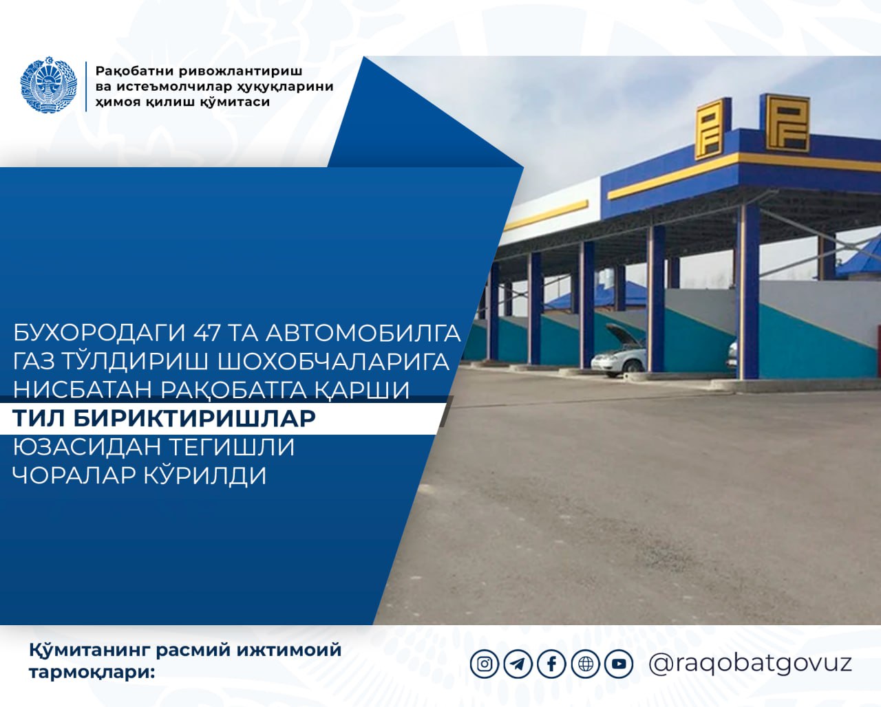 Raqobat qo‘mitasi Buxoro viloyat hududiy boshqarmasi tomonidan o‘tkazilgan monitoringlar davomida avtomobillarga gaz to‘ldirish kompressor shoxobchalarida 2024-yilning 6-dekabriga qadar 1 m³ siqilgan gaz uchun chakana narx 3 850 so‘mdan 3 950 so‘mgachani tashkil etgan bo‘lsa-da, 2024-yilning 7-9-dekabr kunlari 1 m³ gaz uchun chakana narx 4 150 so‘mgacha ya’ni 8 foizgacha oshgani qayd etildi.