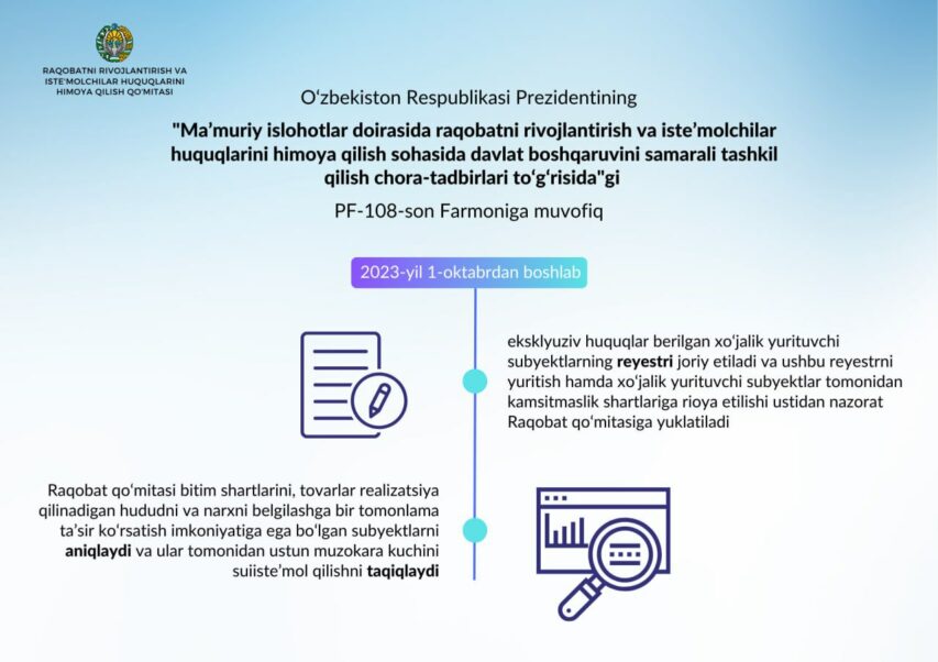 Unga ko‘ra, 2023-yil 1-oktabrdan boshlab eksklyuziv huquqlar berilgan xo‘jalik yurituvchi subyektlarning reyestri joriy etiladi; Raqobat qo‘mitasi bitim shartlarini, tovarlar realizatsiya qilinadigan hududni va ustun muzokara kuchiga ega bo‘lgan subyektlarni aniqlaydi va ular tomonidan ustun muzokara kuchini suiiste’mol qilishni taqiqlaydi.