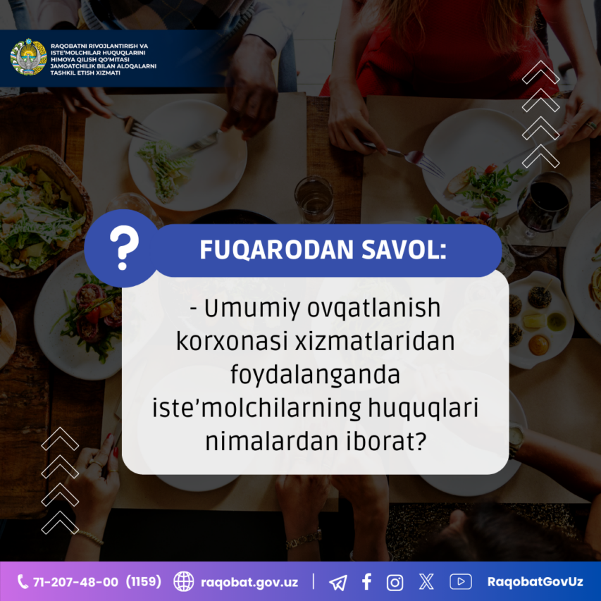 SAVOL: Umumiy ovqatlanish korxonasi xizmatlaridan foydalanganda iste’molchilarning huquqlari nimalardan iborat?