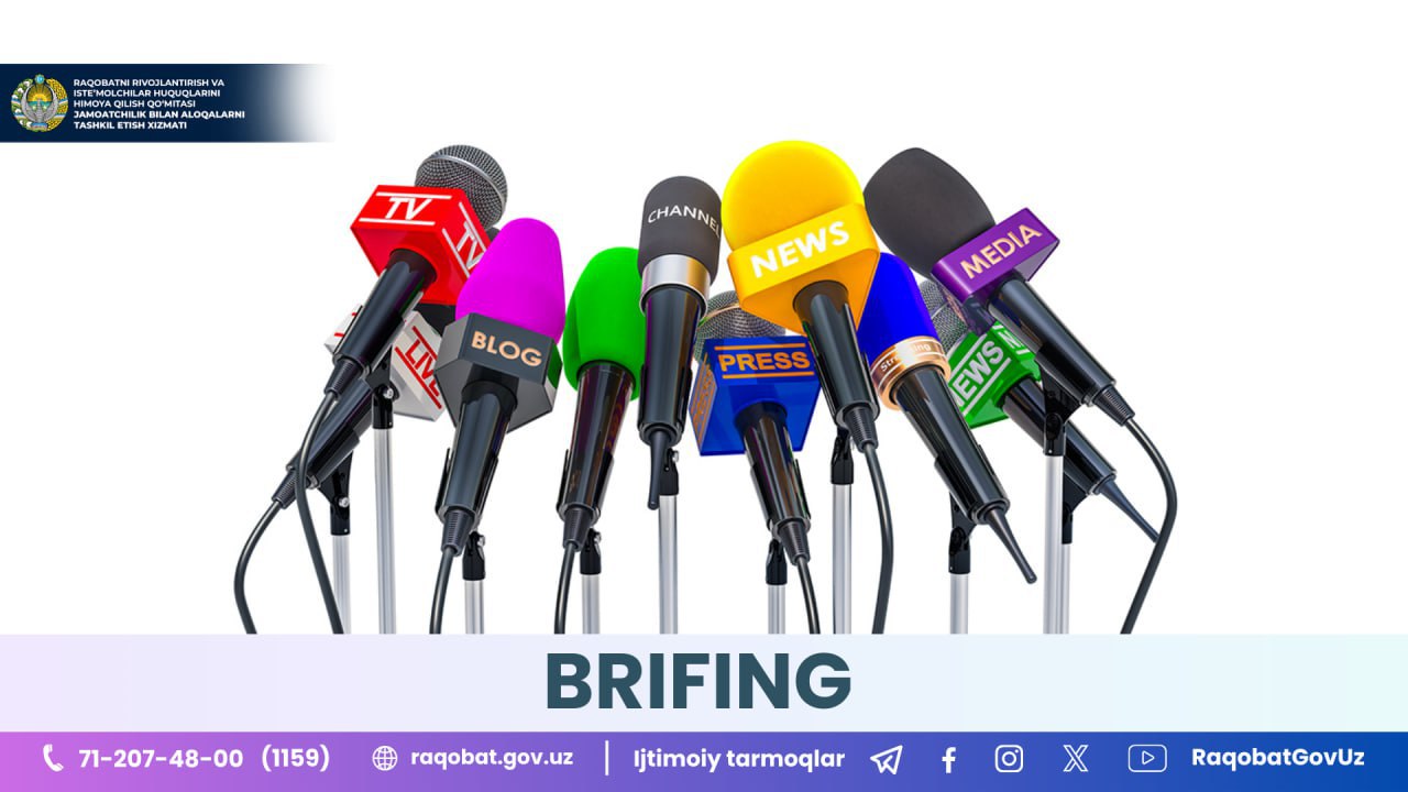 Brifingda Raqobatni rivojlantirish va iste’molchilar huquqlarini himoya qilish qo‘mitasi raisi maslahatchisi Otabek Usmonov ma’lumot beradi («O‘zbekiston 24» va «UzReport TV» telekanallari hamda Youtube tarmogʼi orqali onlayn yoritiladi).