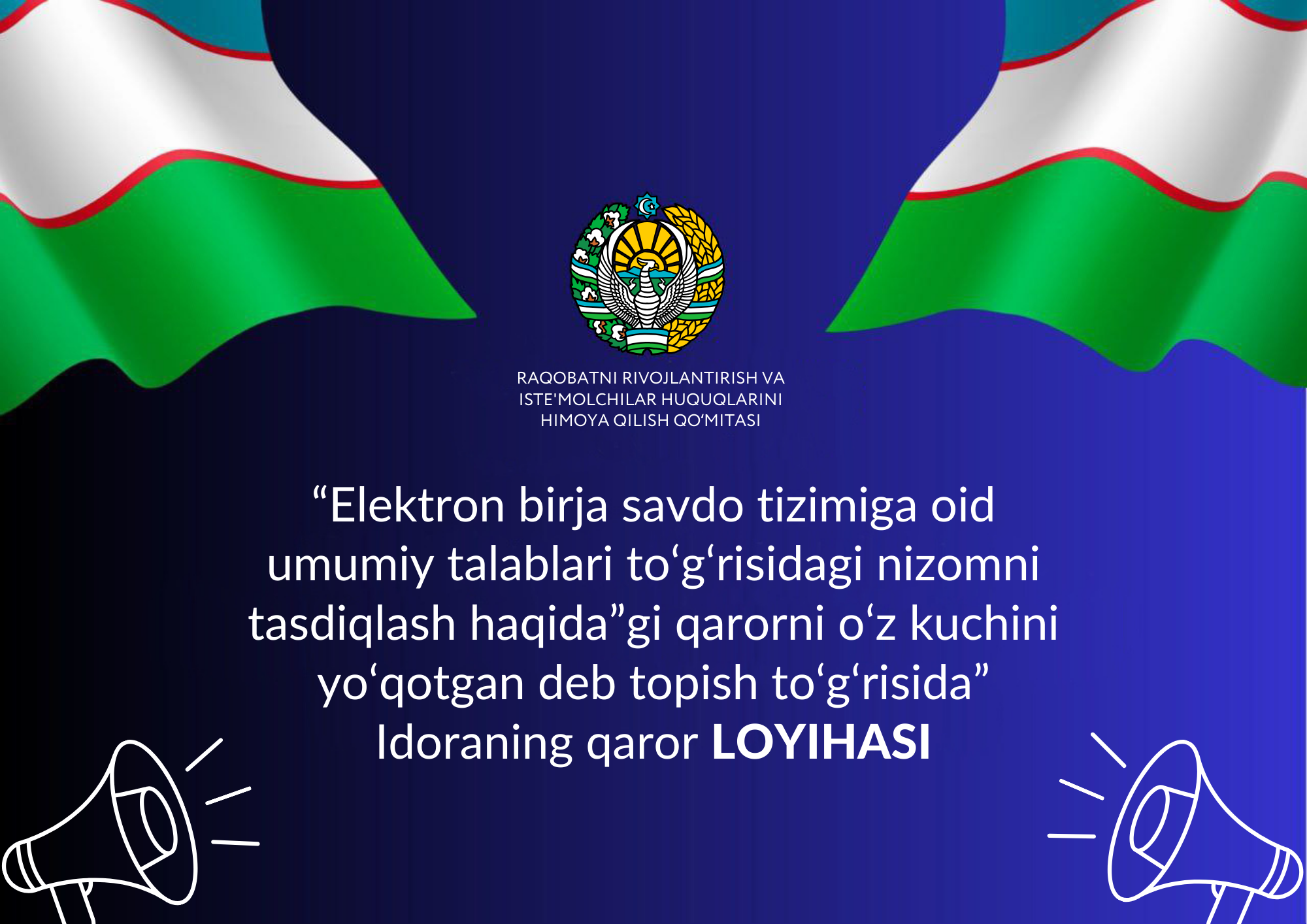 O‘zbekiston Respublikasi Raqobatni rivojlantirish va iste’molchilar huquqlarini himoya qilish qo‘mitasi “Elektron birja savdo tizimiga oid umumiy talablari to‘g‘risidagi nizomni tasdiqlash haqida”gi qarorni o‘z kuchini yo‘qotgan deb topish to‘g‘risida” Idoraning qaror loyihasi normativ-huquqiy hujjatlar loyihalari muhokamasi portali (https://regulation.gov.uz/oz/d/76619)ga joylashtirilganligini ma’lum qiladi.