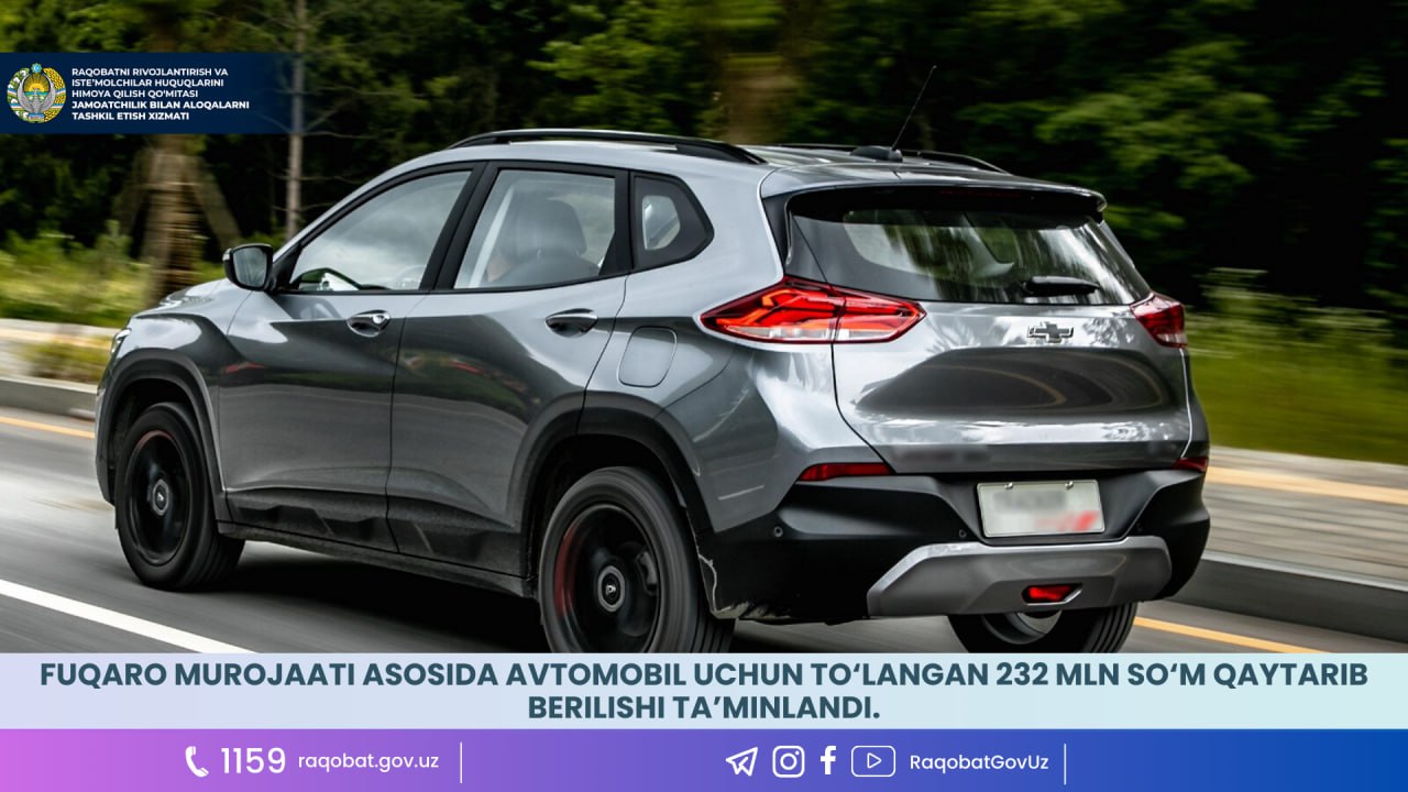 Hududiy boshqarmaning o‘rganish ishlari natijasida yuqoridagi barcha holatlar o‘z isbotini topgan va ushbu holat yuzasidan “Iste’molchilarning huquqlarini himoya qilish to‘g‘risida”gi Qonunining 8-9-moddalariga asosan “ASQASHQADARYO SERVIS” SHK hamda iste’molchilar o‘rtasida tuzilgan shartnoma boshqarmaning ko‘rsatmasiga asosan bekor qilindi va “TRACKER-2” rusumli avtomashinasi uchun to‘langan umumiy 232 000 000 mln so‘m pul mablag‘lari fuqarolar foydasiga to‘liqligicha qaytarib berilishi ta’minlandi.