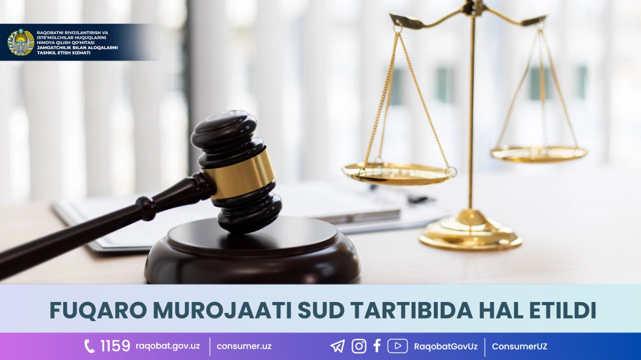 Mazkur murojaatni o‘rganish jarayonida shartnomaviy munosabatlarning bajarilmaganligi inobatga olinib, O‘zbekiston Respublikasi Iste’molchilar huquqlarini himoya qilish to‘g‘risidagi Qonunining 23-25-moddalariga muvofiq Hududiy boshqarma tomonidan Fuqarolik ishlari bo‘yicha Mirzo Ulug‘bek tumanlararo sudiga da’vo ariza taqdim etildi.
