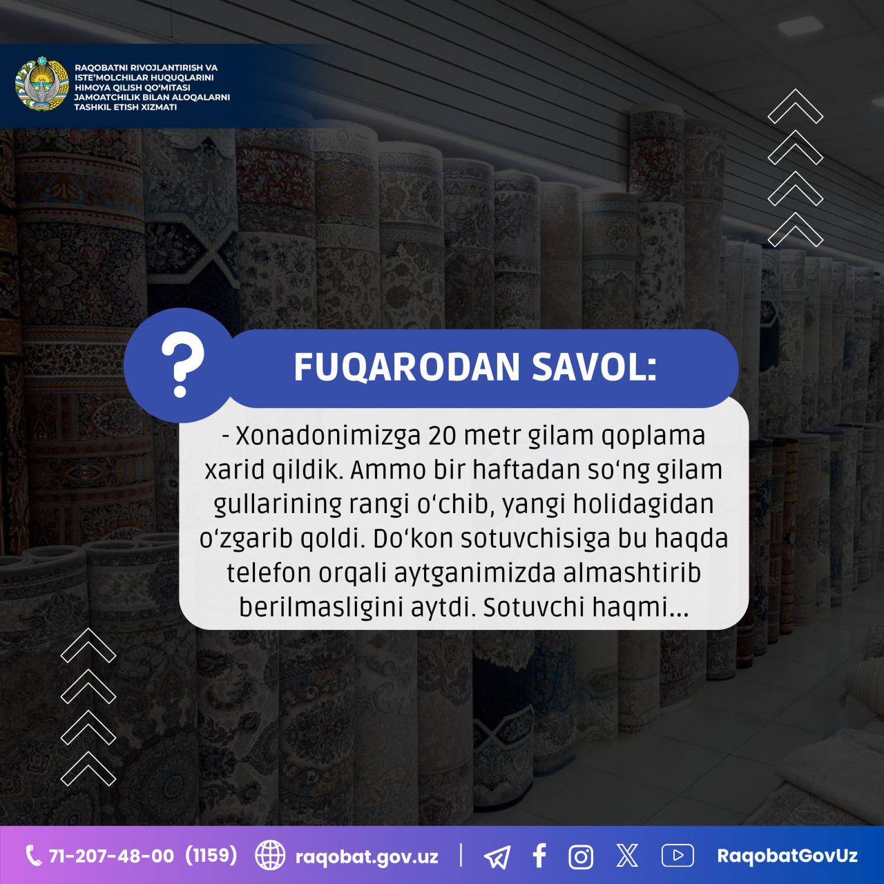 - Xonadonimizga 20 metr gilam qoplama xarid qildik. Ammo bir haftadan so‘ng gilam gullarining rangi o‘chib, yangi holidagidan o‘zgarib qoldi. Do‘kon sotuvchisiga bu haqda telefon orqali aytganimizda almashtirib berilmasligini aytdi. Sotuvchi haqmi…
