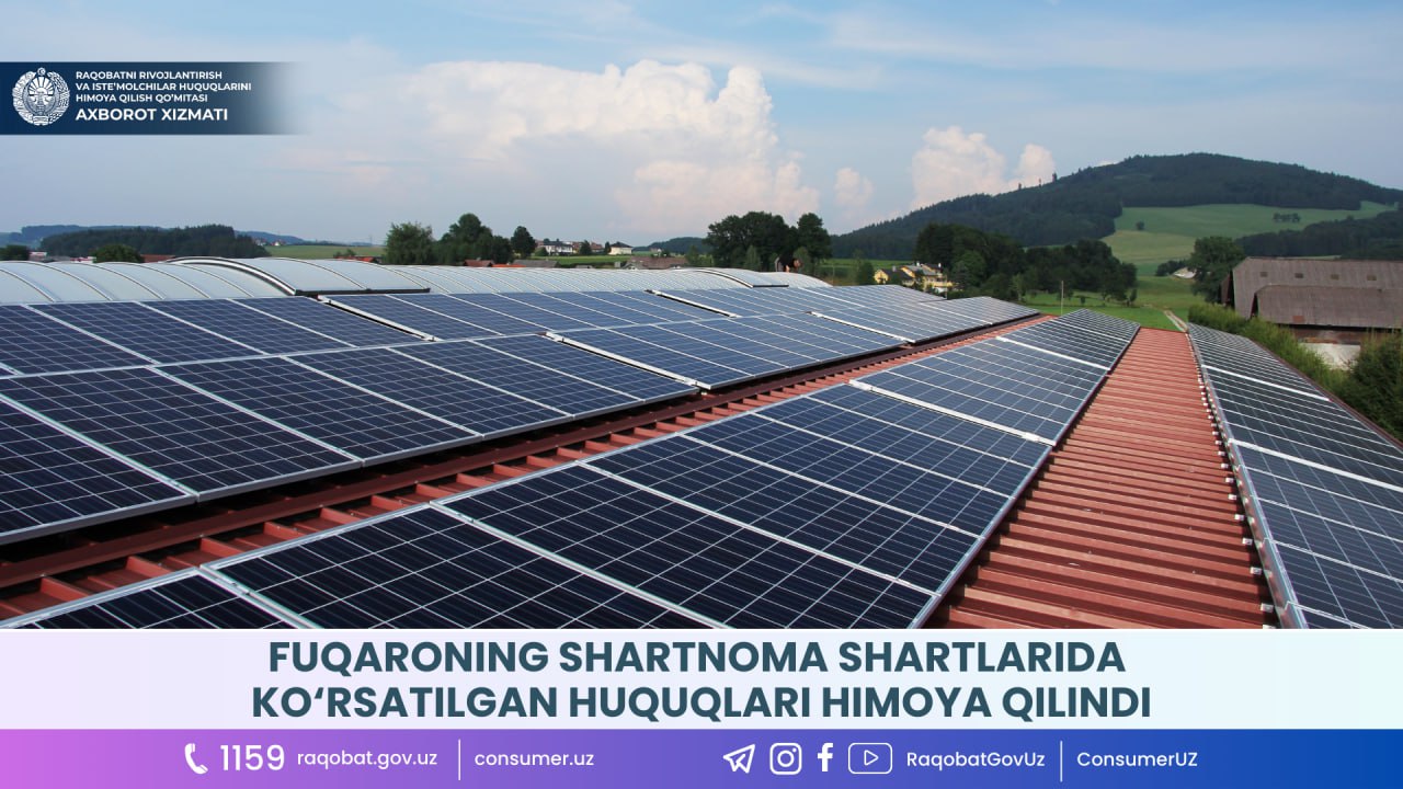 Fuqaro quyosh paneli uchun 60 000 000 so‘m pul mablag‘i evaziga shartnoma imzolanganidan bir necha oy o‘tishiga qaramasdan, ushbu shartnoma shartlari to‘liq bajarilmasdan kelinayotganligi aniqlangan.