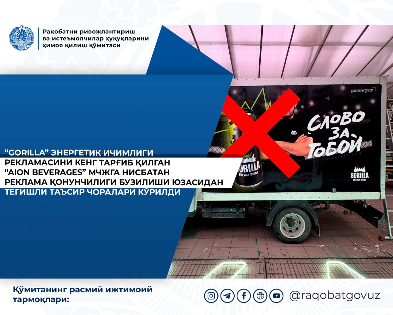Olib borilgan tekshiruvlarda “AION BEVERAGES” MCHJga tegishli 106 ta avtotransport vositasida “Gorilla” energetik ichimligi reklamasi joylashtirilgani oqibatida “Reklama to‘g‘risida”gi Qonun buzilishi aniqlandi. Qonunning 37-moddasi talablariga ko‘ra tashqi reklama va axborot obyektlari orqali energetik ichimliklarni reklama qilish taqiqlanishi belgilangan.