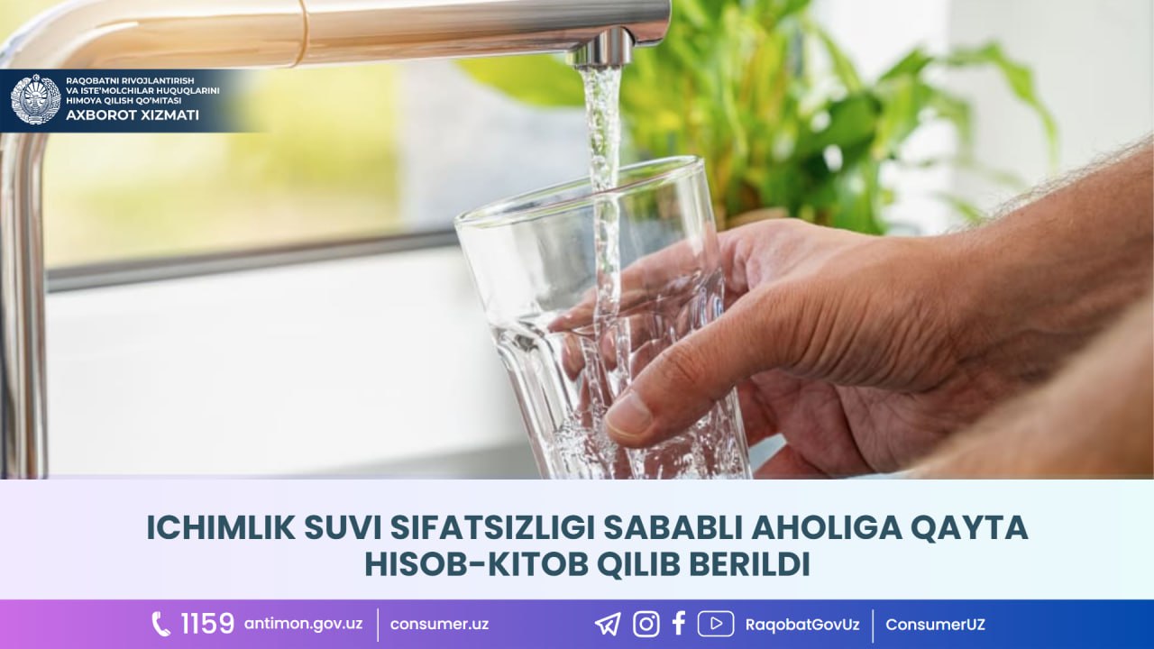 Ushbu murojaat yuzasidan boshqarma xodimlari tomonidan o’rganish ishlari olib borilib, Toshkent mintaqaviy yoʻl uzelining Suv ta’minoti va Binolarni saqlash distansiyasi Xovos tuman boʻlimiga qarashli ichimlik suvidan foydalanuvchi barcha xonadonlarni suv sifati bakteriologik va kimyoviy ko’rsatkichlari O’zDst 950-2011 talablariga javob bermaganligi uchun Oʻzbekiston Respublikasi Vazirlar Mahkamasining 2014 yil 15 iyuldagi 194-son qaroriga 2-ilovasi 5,120,130-bandlari talablariga asosan hamda O’zbekiston Respublikasi “Iste’molchilar huquqlarini himoya qilish to’g’risida”gi qonunining 4,12,19-20-21-moddari talablarini buzilganlik holatlari bo’yicha O’zbekiston Respublikasi Vazirlar Mahkamasining 2005 yil 12 oktyabrdagi 225-son qarori bilan tasdiqlangan Raqobat, tabiiy monopoliyalar, iste’molchilarning huquqlarini himoya qilish va reklama to’g’risidagi qonun hujjatlarini buzganlik uchun belgilangan tartibda ish qo’zg’atilib asossiz hisoblangan qarzdorlik 15 ta xonadon iste‘molchilari foydasiga qayta hisob-kitob qilinishiga erishildi.