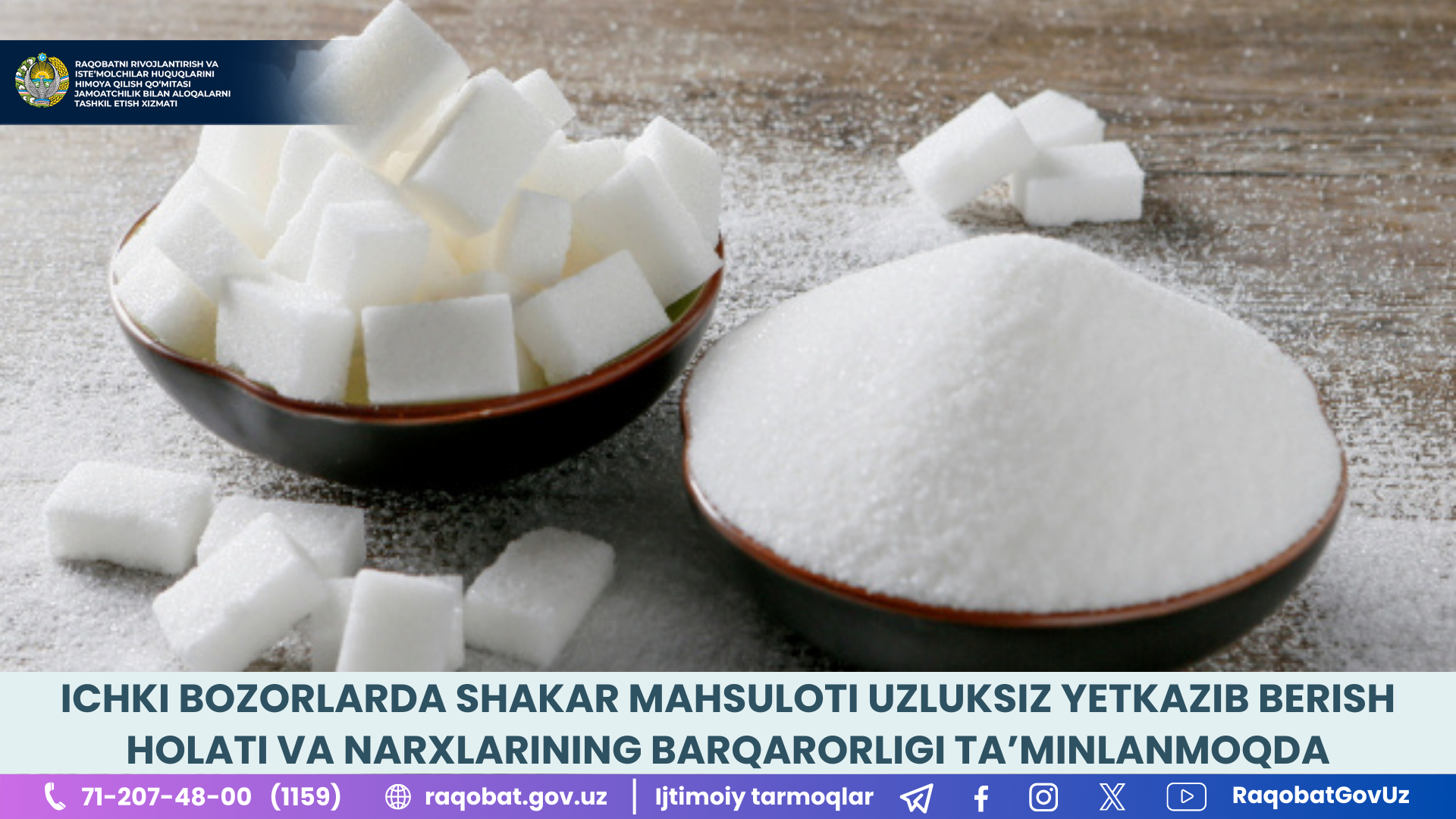 Raqobat qo‘mitasi tomonidan shakar mahsuloti narxlari yuzasidan doimiy monitoring o‘rnatilganligi va uning narxlarini barqaror saqlash bo‘yicha zarur chora–tadbirlar ko‘rilayotganligini ma’lum qilamiz.