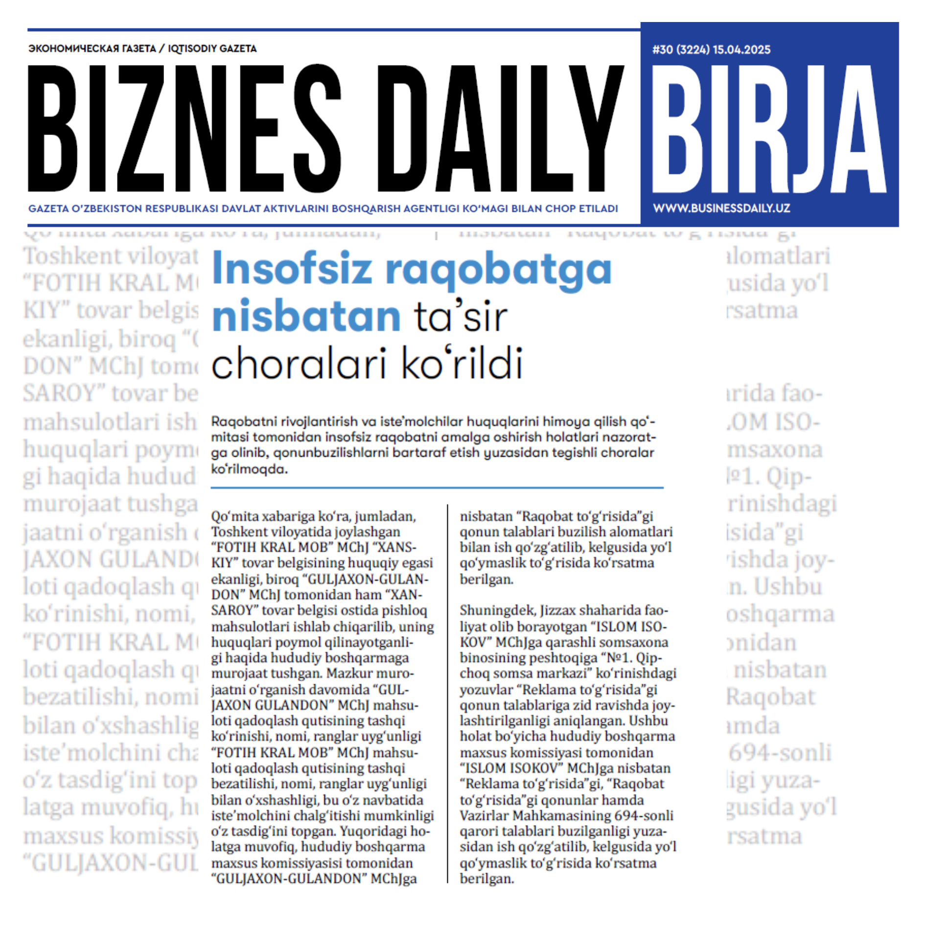 Raqobatni rivojlantirish va iste’molchilar huquqlarini himoya qilish qo‘mitasi tomonidan insofsiz raqobatni amalga oshirish holatlari nazoratga olinib, qonunbuzilishlarni bartaraf etish yuzasidan tegishli choralar ko‘rilmoqda.