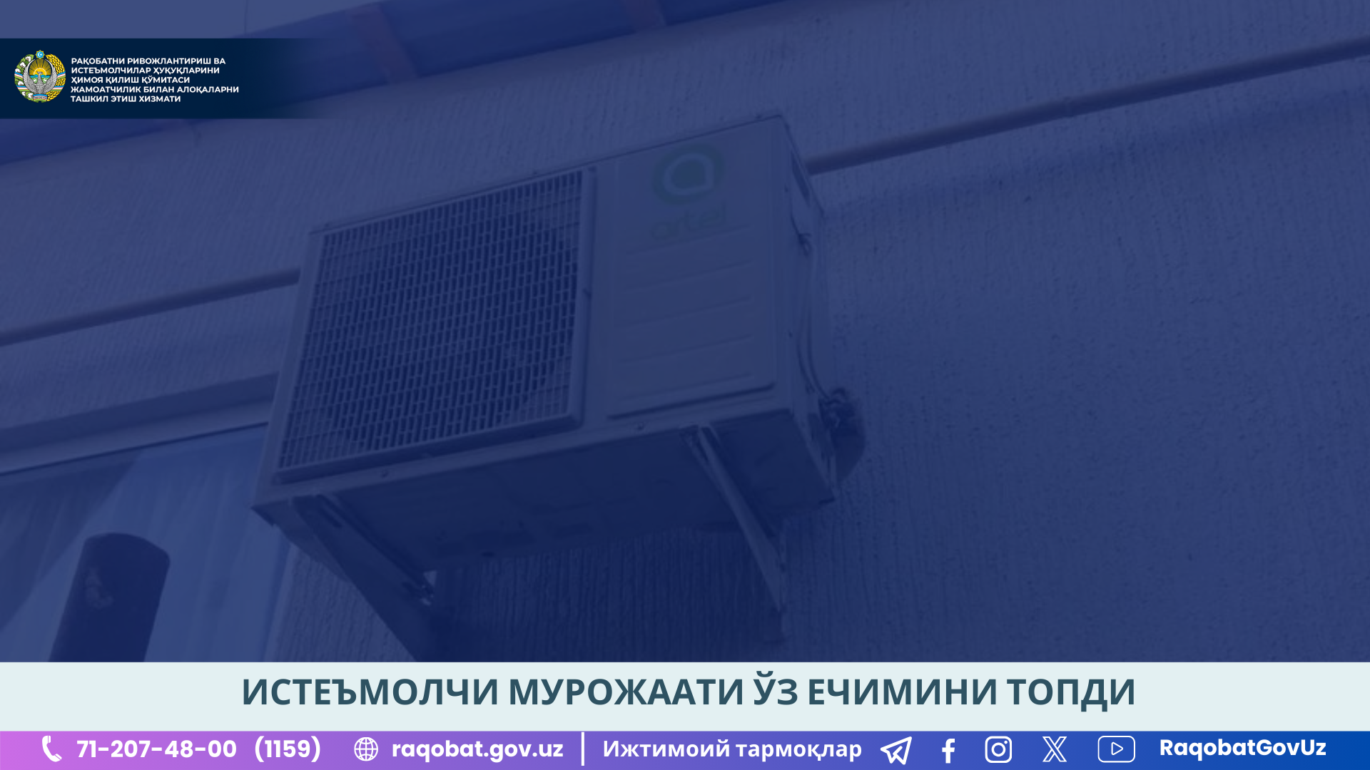 Raqobat qo‘mitasi tomonidan olib borilgan o‘rganishlarda xarid qilinib, 7-qavatga o‘rnatilgan konditsioner kafolat muddatida sifatsiz chiqqani, konditsioner ishlab chiqaruvchining texnik shartlari va tavsiyalarini buzgan holda o‘rnatilgani ma’lum bo‘ldi.