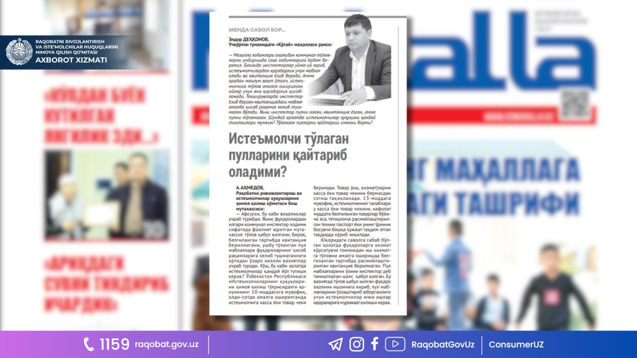 — Afsuski, bu kabi voqeliklar uchrab turibdi. Ya’ni, fuqarolardan ilgari kommunal inspektor xodimi sifatida faoliyat yuritgan mutaxassis to‘lov qabul qilgani, biroq, belgilangan tartibda kvitansiya berilmagani, ushbu to‘langan pul mablag‘lari fuqarolarning hisob raqamlariga kelib tushmaganligi ortidan o‘zaro nizoli vaziyatlar uchrab turadi. Xo‘sh, bu kabi holatda iste’molchilar qanday yo‘l tutishi kerak? O‘zbekiston Respublikasining “Iste’molchilarning huquqlarini himoya qilish to‘g‘risida”gi Qonuni 10-moddasiga muvofiq, oldi-sotdi amalga oshirilganda iste’molchiga kassa yoki tovar cheki beriladi. Tovar (ish, xizmat)larni kassa yoki tovar chekini bermasdan sotish taqiqlanadi; 13-moddasiga muvofiq, iste’molchining talablari u kassa yoki tovar chekini, kafolat muddati belgilangan tovarlar bo‘yicha esa, tegishlicha rasmiylashtirilgan texnik pasport yoki uning o‘rnini bosuvchi boshqa hujjat taqdim etgan taqdirda ko‘rib chiqiladi.