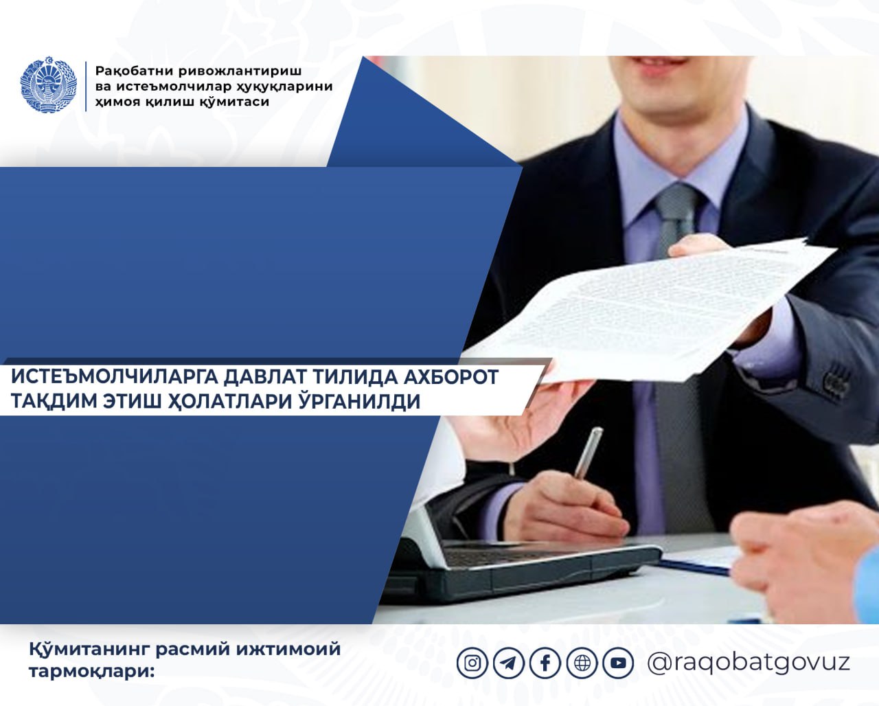 Raqobat qo‘mitasi o‘tkazgan o‘rganish va tahlillarga ko‘ra, ayrim savdo va xizmat ko‘rsatish subyektlari tomonidan o‘z nomi, ish tartibi, tovar (ish, xizmat)lari va qoidalari to‘g‘risida iste’molchilarga to‘g‘ri va tushunarli axborot taqdim etilmayotgani, taomnomalar hamda boshqa ma’lumotlarning davlat tilida berilmayotgani aniqlandi.