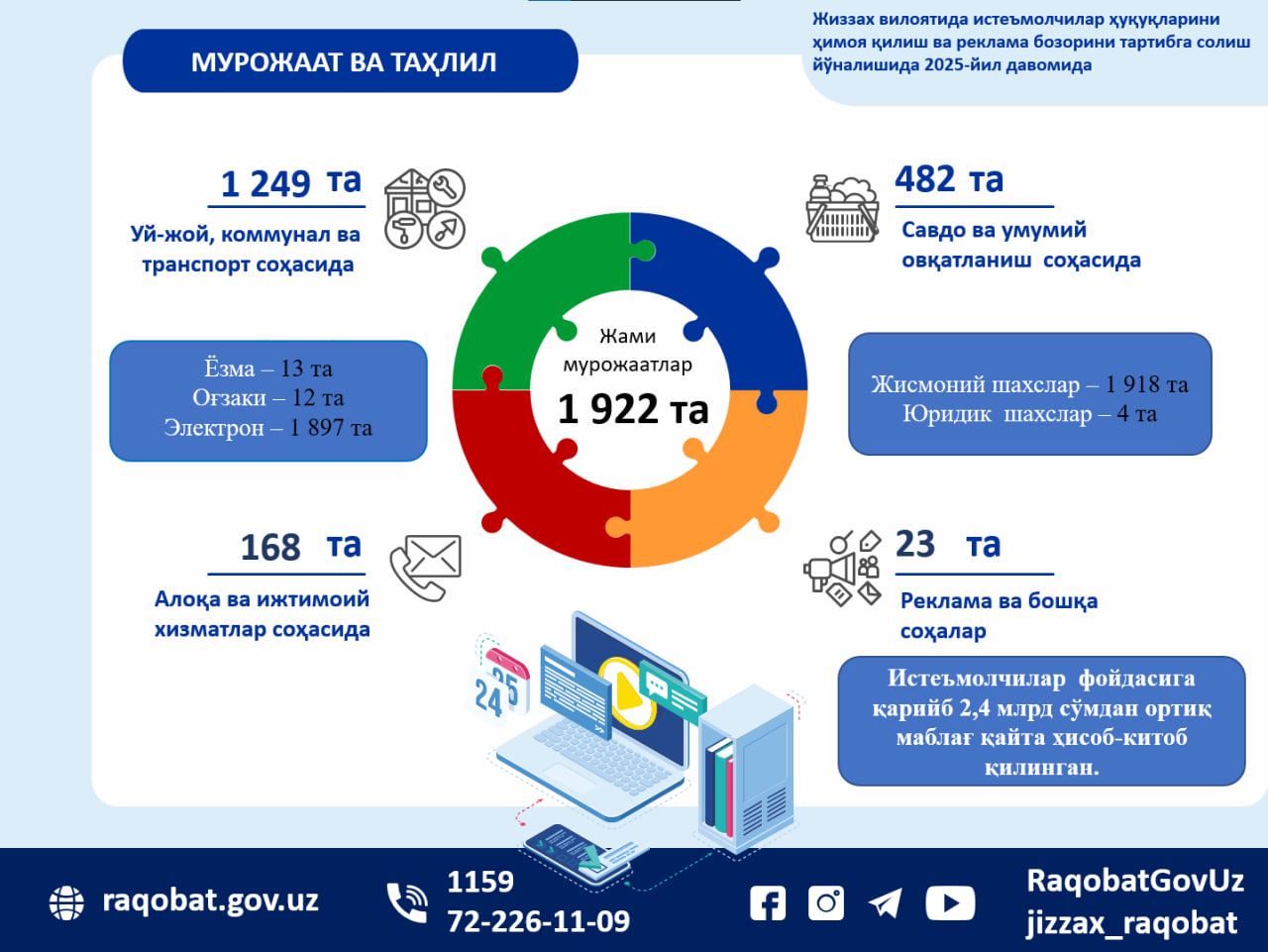 Raqobatni rivojlantirish va iste’molchilar huquqlarini himoya qilish qo‘mitasi Jizzax viloyati hududiy boshqarmasiga o‘tgan 2025-yil davomida iste’molchilardan jami 1 922 ta murojaatlar kelib tushgan.