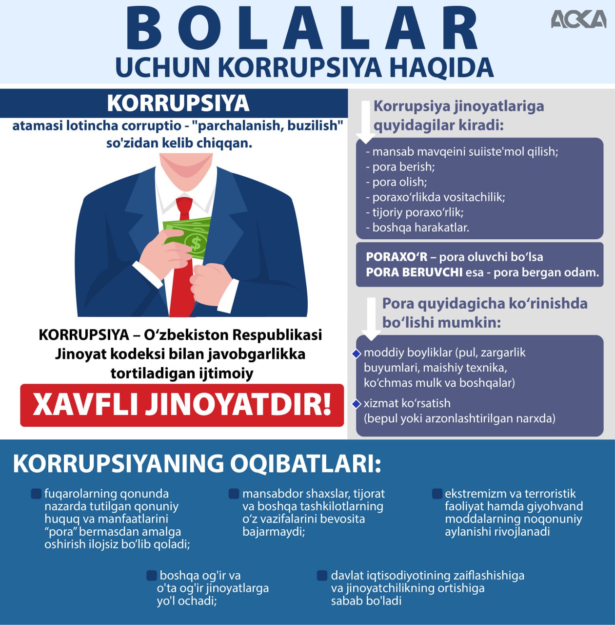 Korrupsiya – O‘zbekiston Respublikasi Jinoyat kodeksi bilan javobgarlikka tortiladigan ijtimoiy xavfli jinoyatdir!