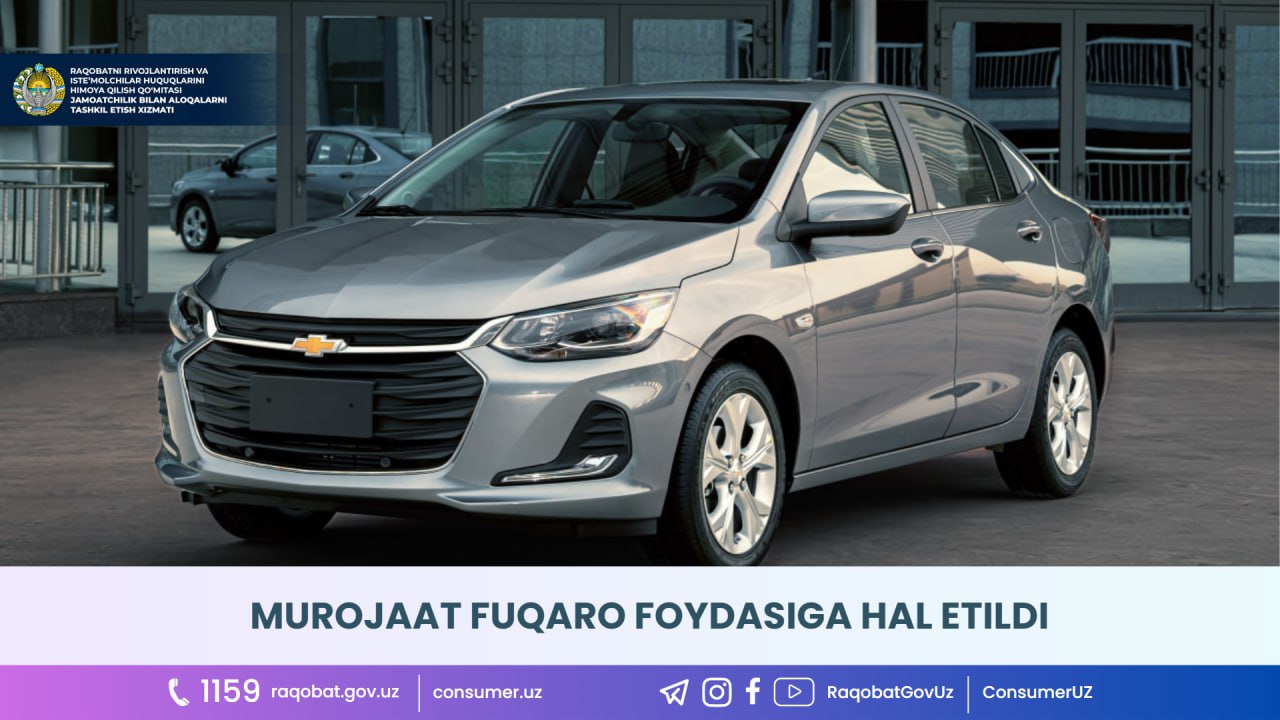 Ushbu murojaatda, fuqaro avtosalondan “Oniks” modeldagi avtomobil uchun belgilangan mablag‘ni to‘lov qilgan. Avtomashina o‘z vaqtida yetkazib berilmagan va fuqaro avtosalondan boshlang‘ich to‘lovini qaytarib olishni talab qilgan, ammo fuqaroning murojaati avtosalon tomonidan yechimini topmagan. Ushbu holat yuzasidan iste’molchi norozi bo‘lib hududiy boshqarmadan amaliy yordam so‘ragan.