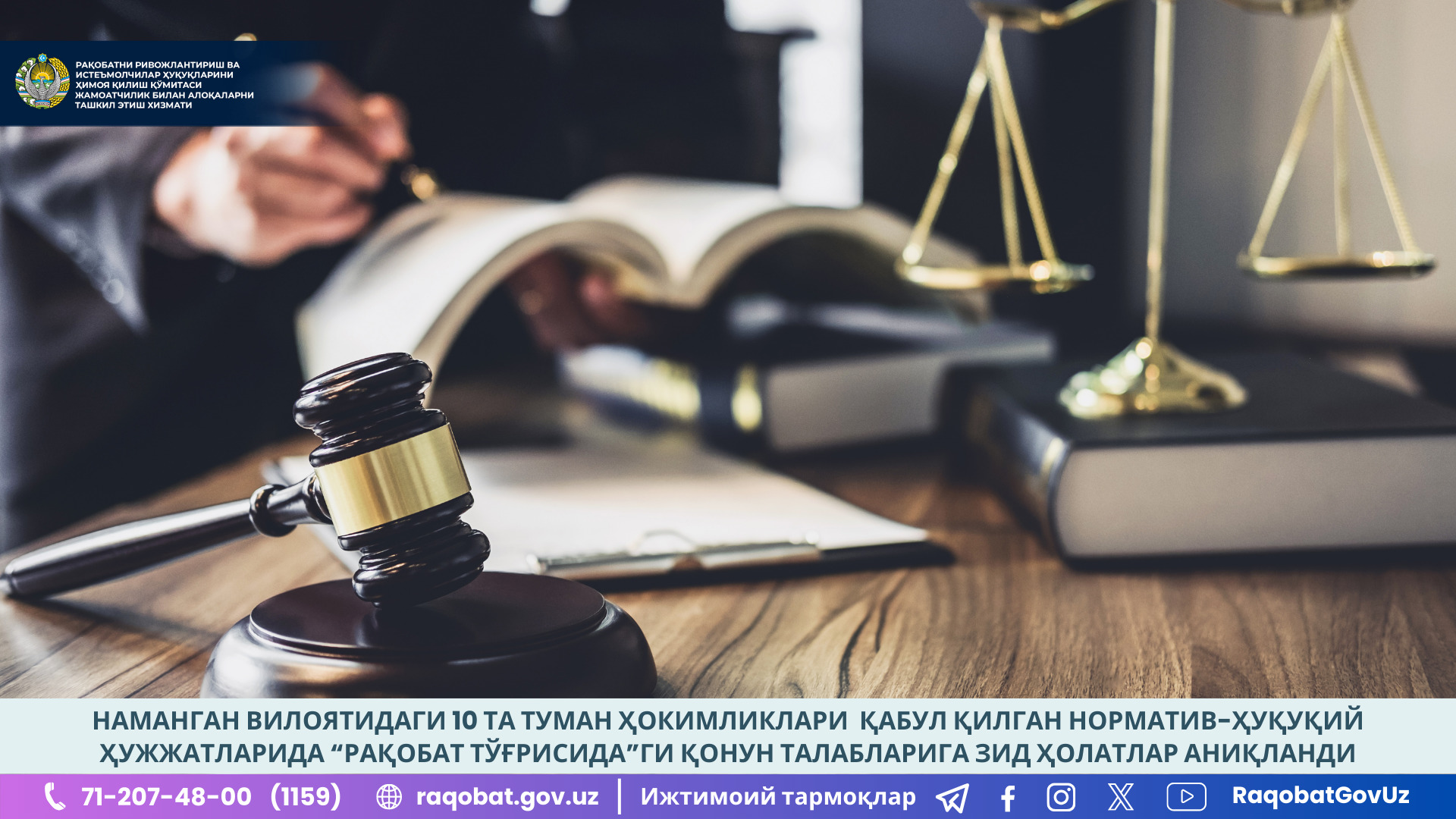 Mazkur o‘rganishlar jarayonida, Mingbuloq, Kosonsoy, Pop, Norin, Namangan, To‘raqo‘rg‘on, Uychi, Chust, Chortoq va Yangiqo‘rg‘on tuman hokimliklarida tovar yoki moliya bozorida raqobatni cheklashga hamda iste’molchilarning huquqlari va qonuniy manfaatlarini kamsitishga olib keluvchi jami 12 ta qarorlarni qabul qilinishi natijasida “Raqobat to‘g‘risida”gi Qonunning 22-moddasi talablari buzilishi holatlariga yo‘l qo‘yilgani aniqlandi.