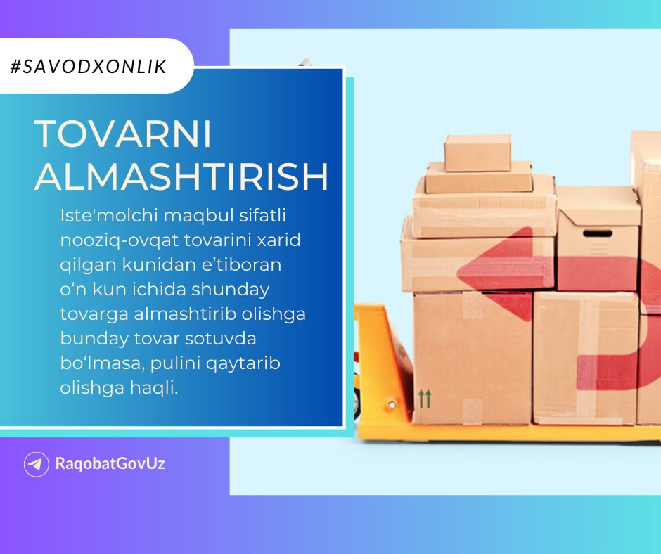 Iste’molchi maqbul sifatli nooziq-ovqat tovarini xarid qilgan kunidan e’tiboran 10 kun ichida sotuvchidan uni ayni shunday tovarga almashtirib olishga bunday tovar sotuvda bo‘lmasa, pulini qaytarib olishga haqli.