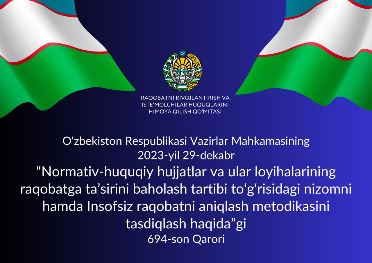 O‘zbekiston Respublikasi Vazirlar Mahkamasining 2023-yil 29-dekabrdagi 694-sonli qarori bilan Normativ-huquqiy hujjatlar va ular loyihalarining raqobatga taʼsirini baholash tartibi to‘g‘risidagi nizom tasdiqlandi.