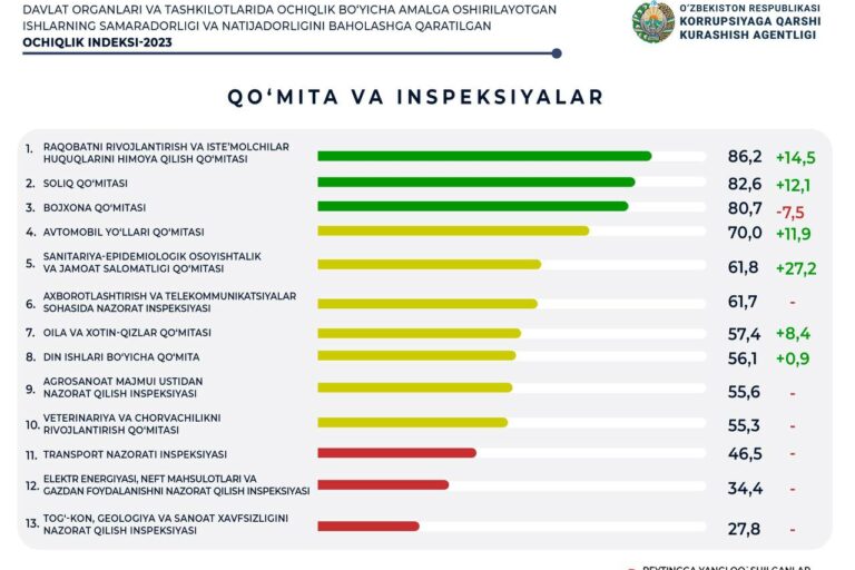 Korrupsiyaga qarshi kurashish agentligi va boshqa hamkor tashkilotlarning Respublika baholash kommissiyasi natijalariga ko‘ra Raqobat qo‘mitasi Ochiqlik indeksi reytingida yuqori ko‘rsatkichni qayd etib Davlat Qo‘mita va Inspeksiyalar ichida 1-o‘rin… 01.04.2024