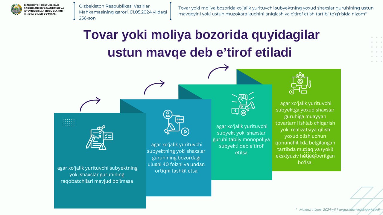 agar xo‘jalik yurituvchi subyektning yoki shaxslar guruhining bozordagi ulushi 40 foizni va undan ortiqni tashkil etsa;