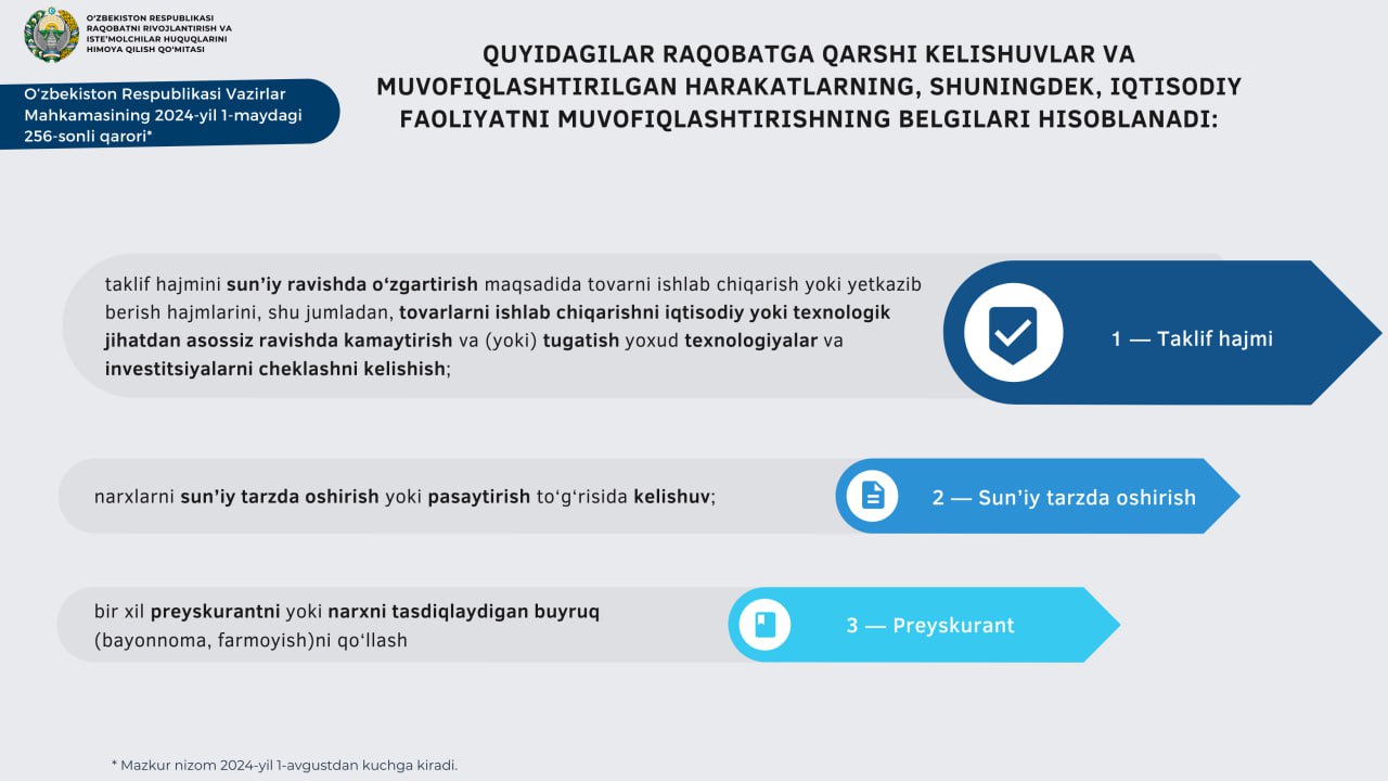 O‘zbekiston Respublikasi Vazirlar Mahkamasining 2024-yil 1-maydagi 256-sonli qarori bilan Raqobatga qarshi kelishuvlarni va muvofiqlashtirilgan harakatlarni aniqlash tartibi to‘g‘risida nizom tasdiqlandi.