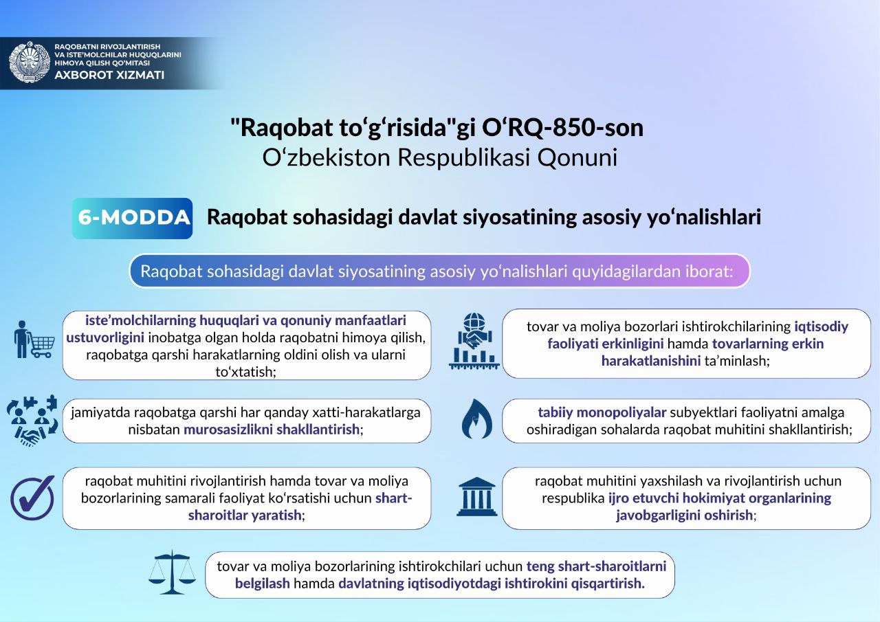 Iyul292023Raqobat sohasidagi davlat siyosatining asosiy yo’nalishlari Ushbu yangilik bilan boʻlishish Share on FacebookShare on Facebook TweetShare on Twitter Pin itShare on Pinterest Share on WhatsAppShare on WhatsApp Share on LinkedInShare on LinkedIn Boshqa yangiliklarYOG‘-MOY KORXONASIGA 4,8 mlrd SO‘MLIK YUQORI LIKVIDLI MAHSULOTLAR TO‘G‘RIDAN-TO‘G‘RI SOTILGANLIK HOLATI YUZASIDAN TEGISHLI TA’SIR CHORASI QO‘LLANILDI12.11.2025Mamlakatimizda 2025-yilning 8-noyabridan “Yashil makon” umummilliy loyihasi doirasida “dolzarb bir oylik” e’lon qilindi11.11.2025Raqobat qo‘mitasi va uning hududiy boshqarmalariga fuqarolarning raqamli platforma operatorlari faoliyati yuzasidan tushgan murojaatlari o‘rganib chiqilib o‘z yechim topmoqda.11.11.2025Elektr energiyasi uchun 1,8 mlrd so‘mdan ortiq asossiz hisoblangan qarzdorlik qayta hisob-kitob qilish to‘g‘risida ko‘rsatma berildi11.11.2025INSOFSIZ RAQOBAT HOLATLARI YUZASIDAN “SUPERSHOP” MCHJga NISBATAN TEGISHLI TA’SIR CHORASI KO‘RILDI10.11.2025Raqobat qo‘mitasi iste’molchilarni ogohlikka chaqiradi:10.11.2025