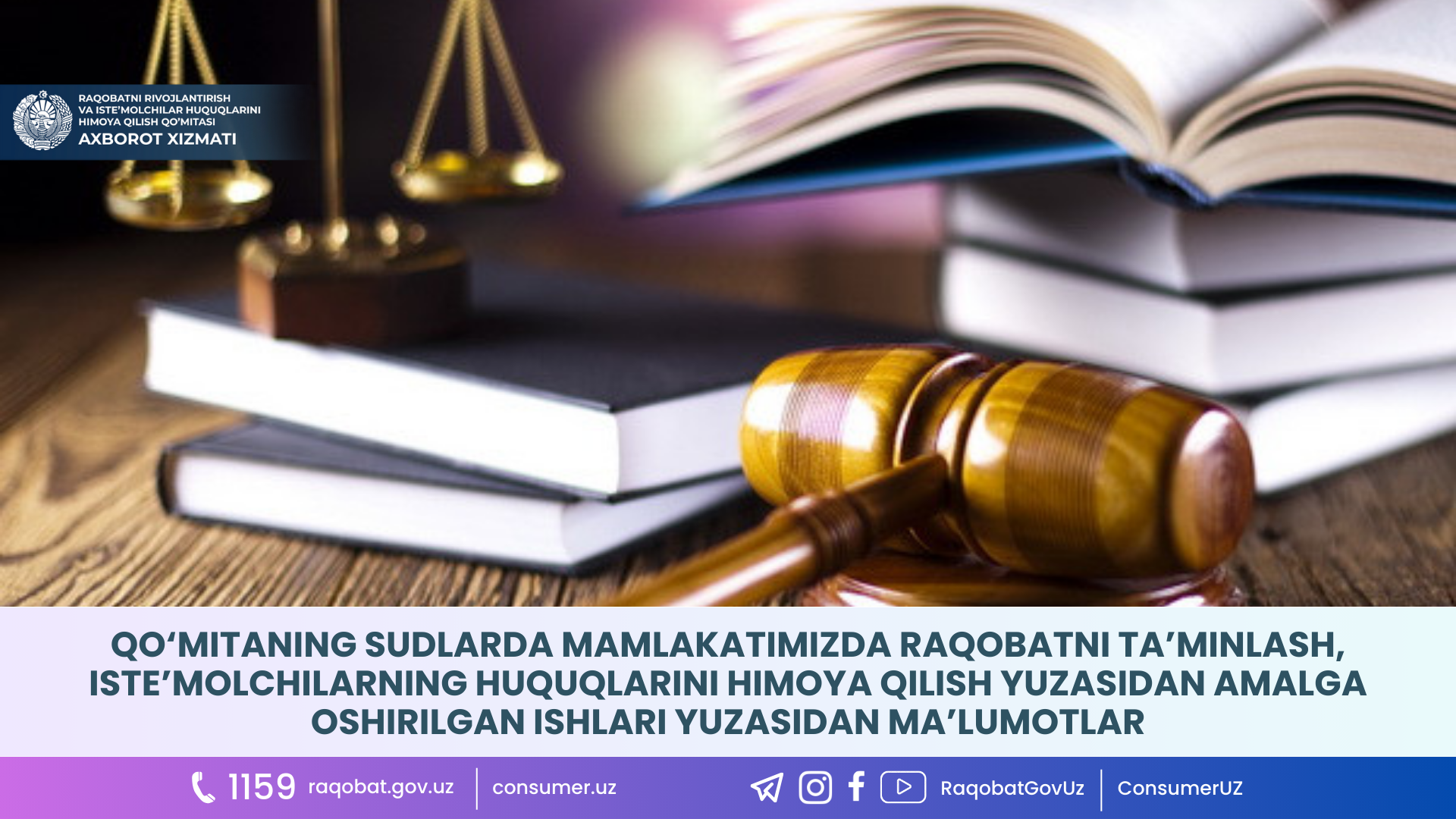 O‘zbekiston Respublikasi Raqobatni rivojlantirish va iste’molchilar huquqlarini himoya qilish qo‘mitasi o‘z faoliyati yuzasidan raqobatni ta’minlash, iste’molchilar huquqlarini himoya qilish bo‘yicha sud instansiyalarida faol qatnashib kelmoqda.