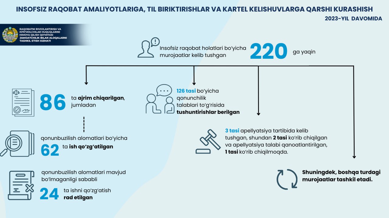 Raqobat qo‘mitasi tomonidan insofsiz raqobat amaliyotlari, til biriktirish va kartel kelishuvlarga qarshi kurashish sohasida joriy yilning o’tgan davri mobaynida amalga oshirilgan ishlar to’g’risida infografik ma’lumot.