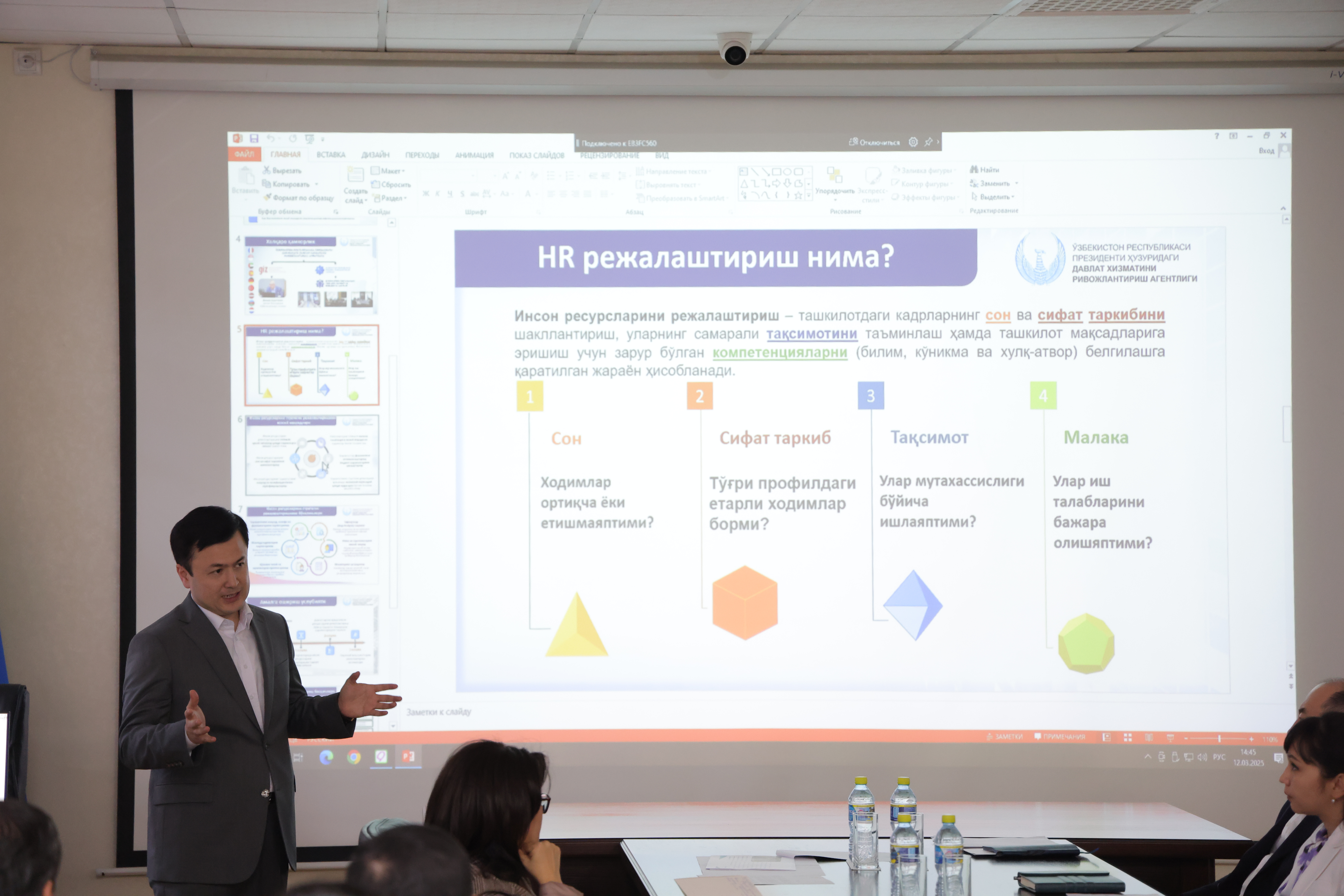 Tadbir davomida davlat fuqarolik xizmatida inson resurslarini strategik rejalashtirish va professiografik tahlil mavzularida fikr-mulohazalar almashilib, so‘rovnomalar ham o‘tkazildi.