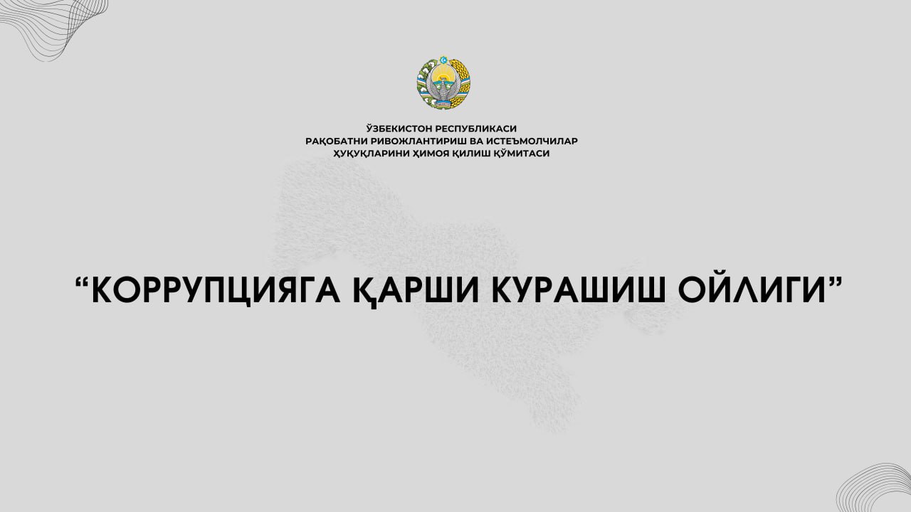 Raqobatni rivojlantirish va iste’molchilar huquqlarini himoya qilish qo‘mitasi tizimida joriy yilning 20-dekabrgacha “Korrupsiyaga qarshi kurashish oyligi” deb e’lon qilindi.