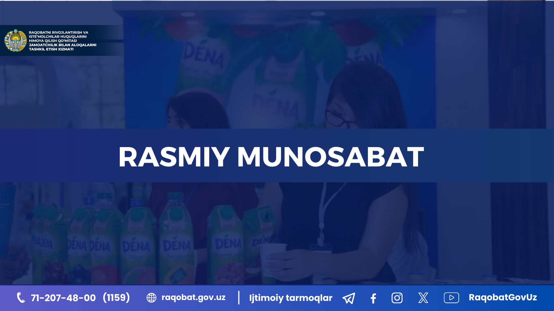 Raqobatni rivojlantirish va iste’molchilar huquqlarini himoya qilish qo‘mitasiga “Marwin Brands” MChJ bosh texnologi Shermuxammad Xolmuxamedov korxonada ishlab chiqarilayotgan sharbatlar, ularning turlari, partiyalari va saqlash sharoitlari haqida ma’lumot berdi. Shuningdek, korxona tomonidan bozorga taqdim etilayotgan iste’molga yaroqsiz mahsulotlar mavjud emasligini o‘z rasmiy munosabatini video orqali bildirdi.