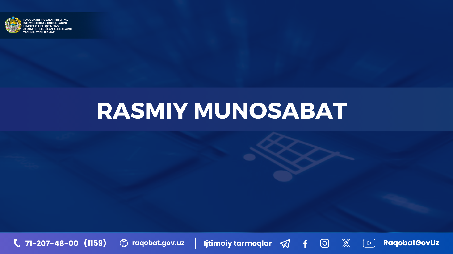 Ijtimoiy tarmoq orqali “Raqobat to‘g‘risidagi qonunlar ishlamayaptimi?” sarlavhasi ostida murojaat qoldirilgan. Mazkur murojaatda Respublika Agrokimyoviy tahlil markazi (buyurtmachi) tomonidan 14.12.2023 yil etender.uzex.uz elektron tizimida lot orqali markaz va uning hududiy markazlari uchun portatip laboratoriya jihozi, plamenniy fotometr, vetijnoy shkaf, bidistitlyator, spektofotometrlar xaridi uchun eng yaxshi takliflarni tanlab olishda ikkita ishtirokchi qatnashganligi va bu ikkala firma ham bir kishiga qarashli ekanligi tanqid qilingan.