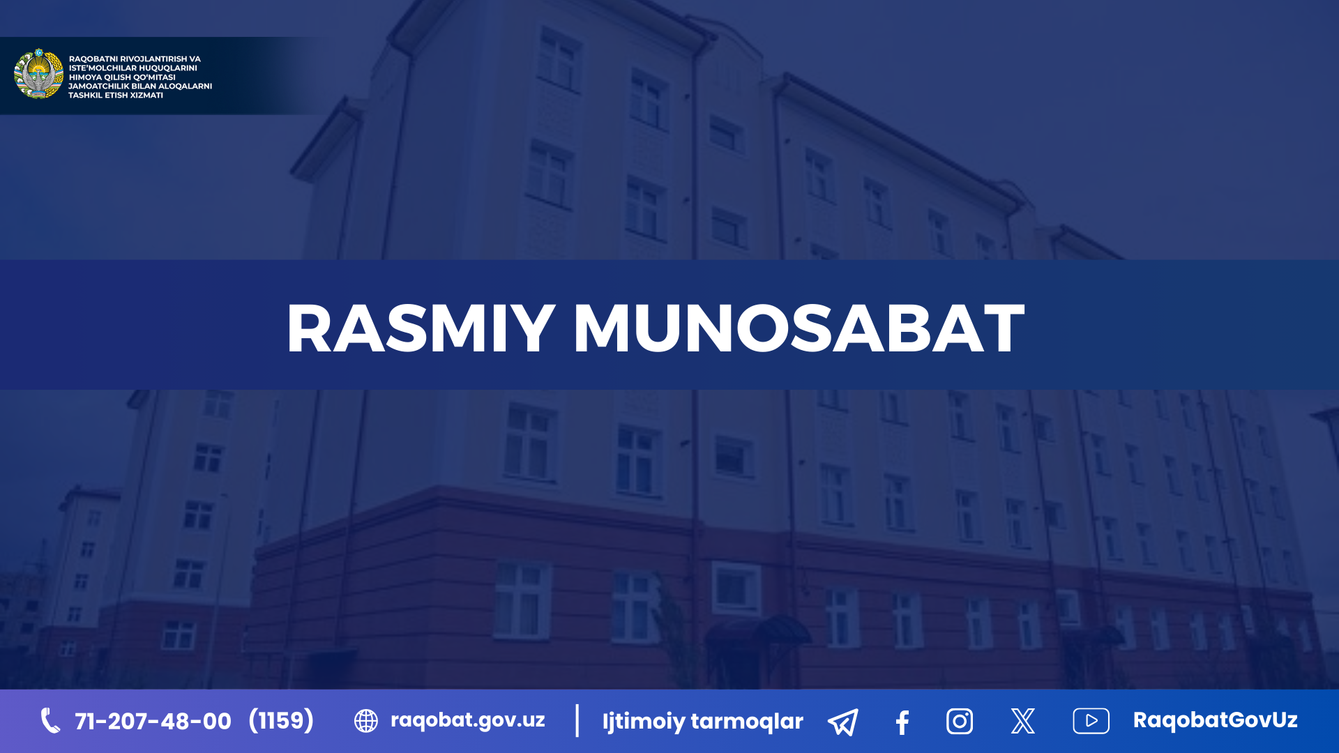 Raqobatni rivojlantirish va iste’molchilar huquqlarini himoya qilish qo‘mitasi mazkur murojaat yuzasidan quyidagilarni ma’lum qiladi. Mazkur murojaatni o‘rganib chiqish jarayonida fuqaro U.J. bilan “Termiz metall payvandlash” MChJ o‘rtasida turar-joyning qurilishida investitsion badal kiritish to‘g‘risida 2023-yil 25-noyabr kuni shartnoma rasmiylashtirilgan bo‘lib, biroq ushbu shartnomada uyni fuqaroga topshirish muddati shuningdek, quruvchi tashkilotning iste’molchi oldidagi boshqa majburiyatlari aks ettirilmaganligi ma’lum bo‘ldi.
