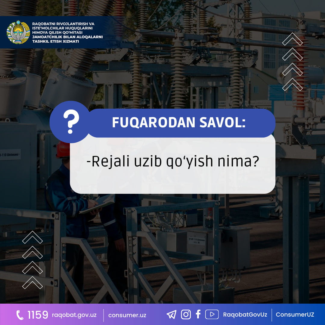 – Rejali uzib qo‘yish — agar elektr ta’minoti shartnomasida boshqacha qoida nazarda tutilmagan bo‘lsa, hududiy elektr tarmoqlari korxonasining elektr qurilmalarini rejali–ogohlantirish ta’mirlash jadvali bo‘yicha ta’mirlash yoki profilaktika qilish davrida iste’molchilarni oldindan (kamida 3 sutka oldin) ogohlantirgan holda iste’molchiga elektr energiyasi berishni to‘liq yoki qisman to‘xtatish.