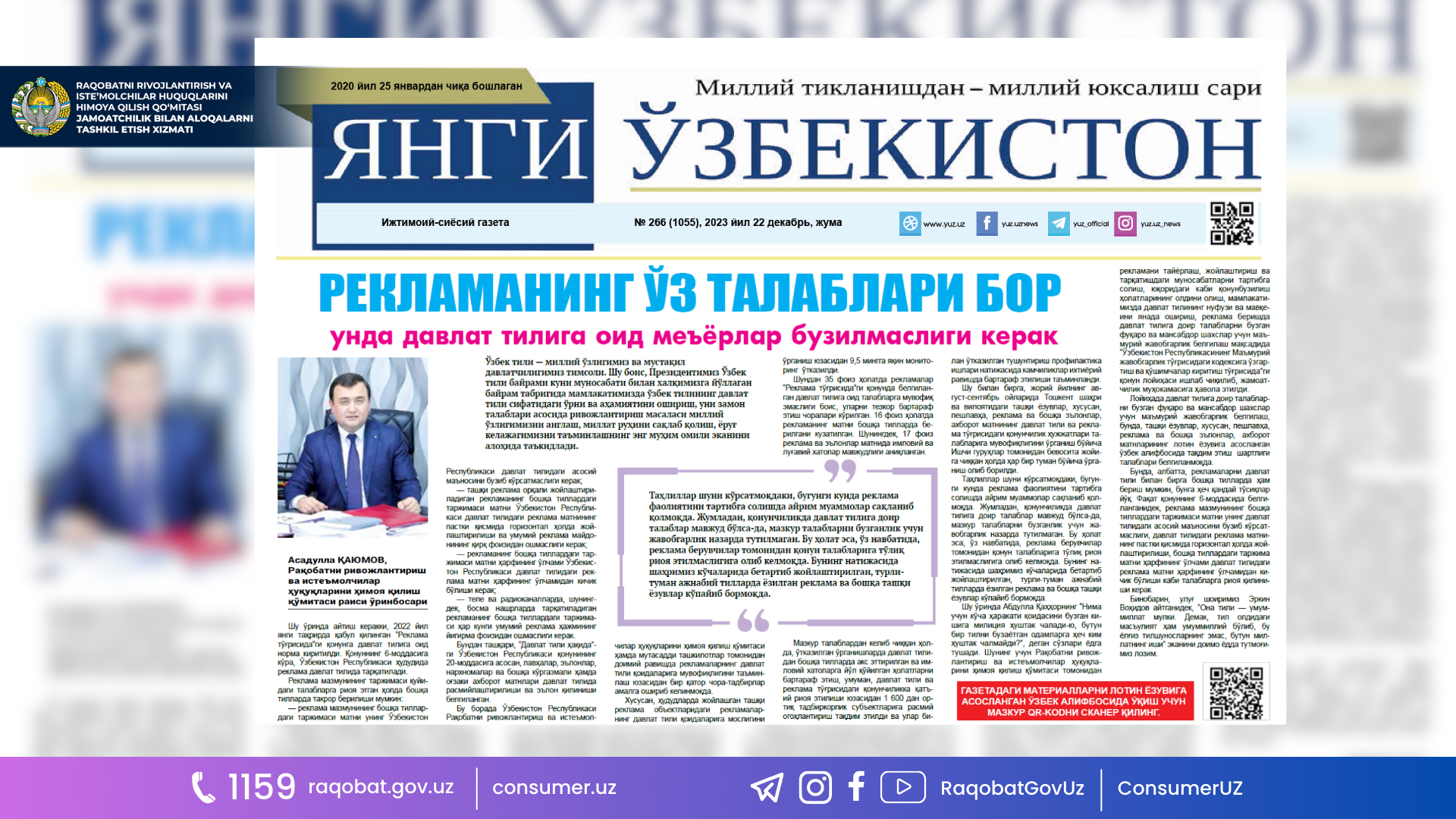 Shuning uchun Raqobatni rivojlantirish va iste’molchilar huquqlarini himoya qilish qo‘mitasi tomonidan reklamani tayyorlash, joylashtirish va tarqatishdagi munosabatlarni tartibga solish, yuqoridagi kabi qonunbuzilish holatlarining oldini olish, mamlakatimizda davlat tilining nufuzi va mavqeini yana-da oshirish, reklama berishda davlat tiliga doir talablarni buzganlik uchun fuqaro va mansabdor shaxslar uchun ma’muriy javobgarlik belgilash maqsadida “O‘zbekiston Respublikasining Ma’muriy javobgarlik to‘g‘risidagi kodeksiga o‘zgartish va qo‘shimchalar kiritish to‘g‘risida”gi qonun loyihasi ishlab chiqilib, jamoatchilik muhokamasiga havola etildi.