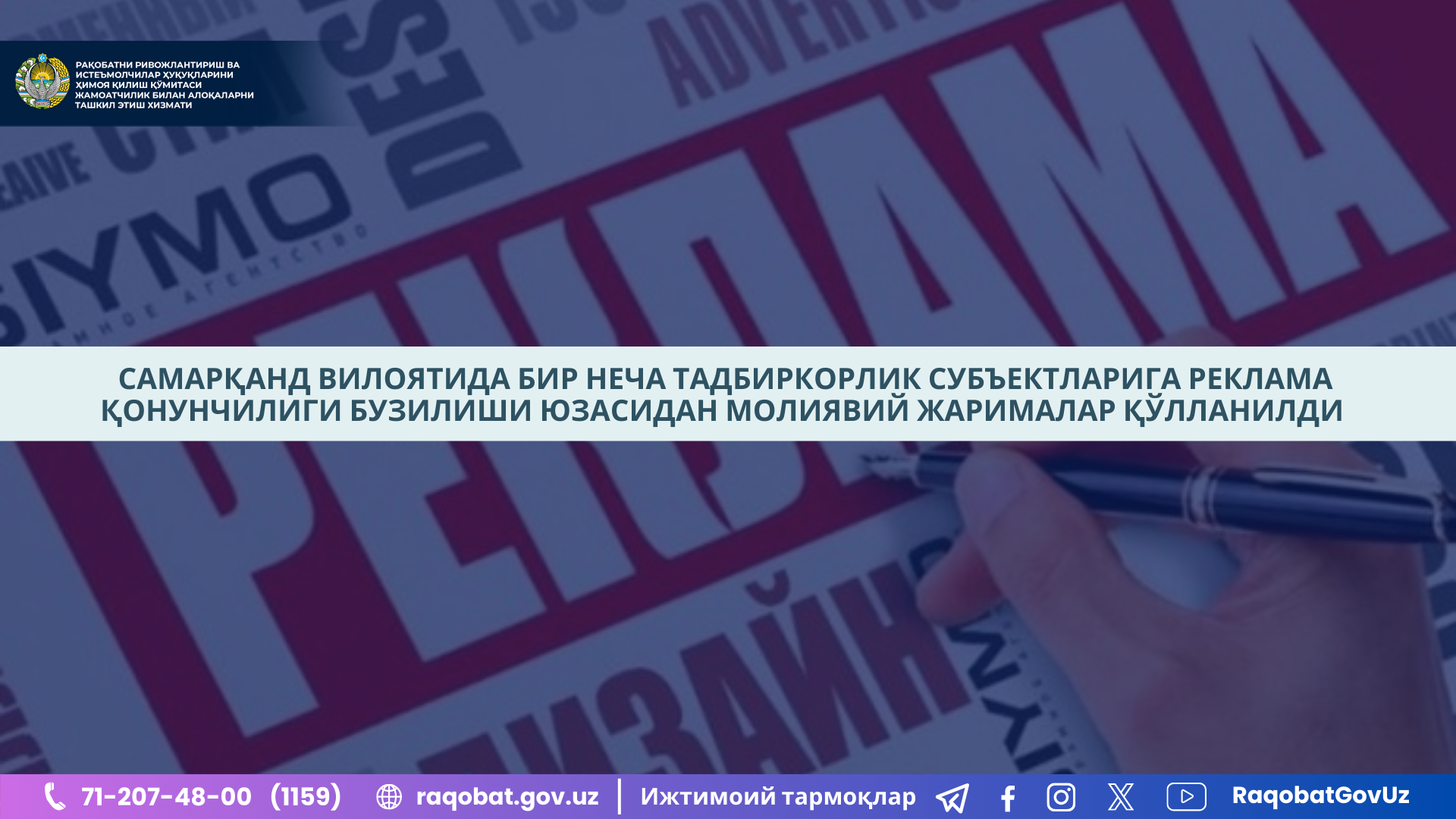 Raqobat qo‘mitasi “Reklama to‘g‘risida”gi Qonunga muvofiq, reklamaning aylanishi sohasidagi qonunbuzilish holatlarini nazorat qiluvchi vakolatli davlat organi hisoblanib, bu borada muntazam ravishda tizimli ishlar olib borilmoqda.