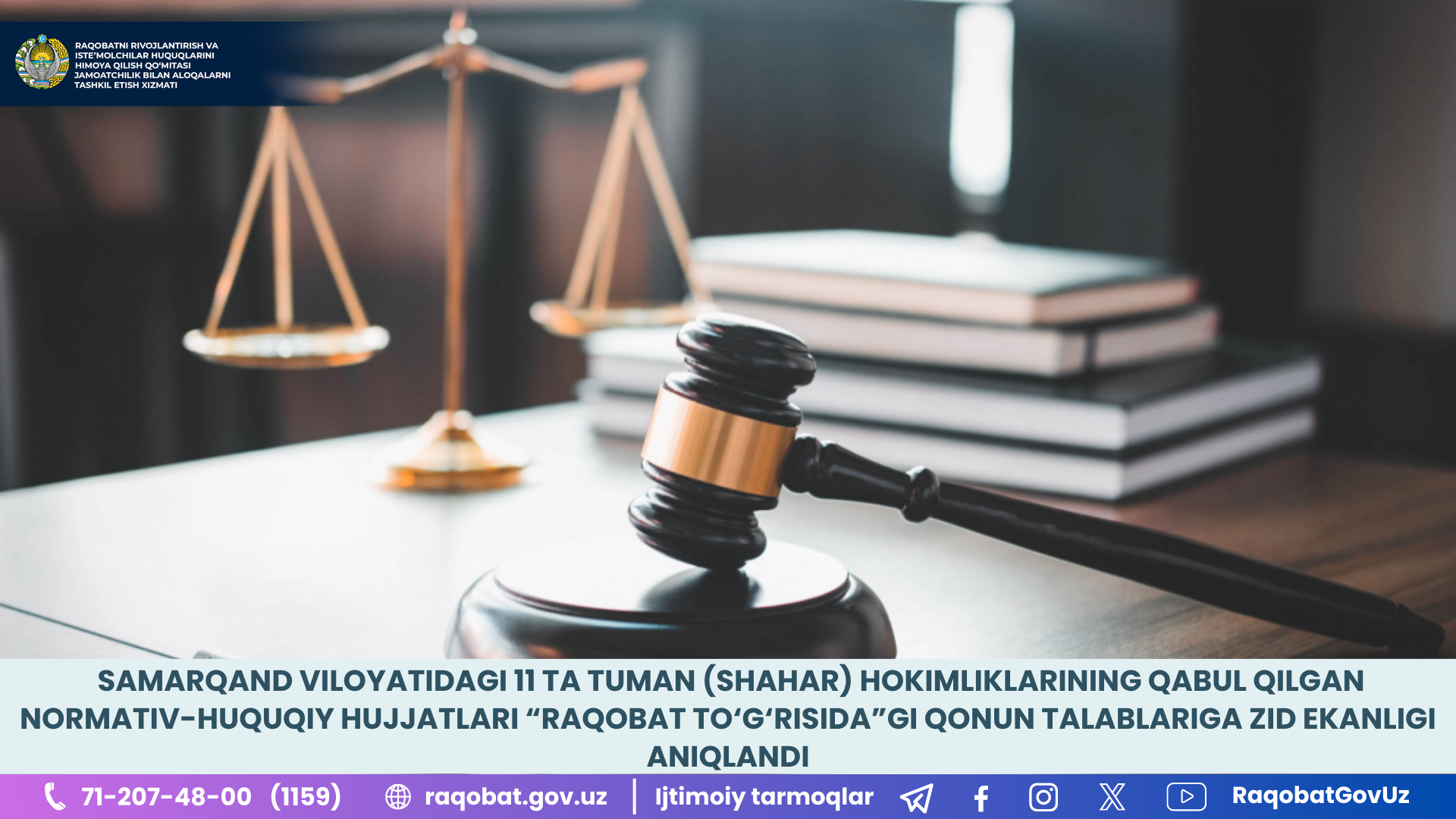 Joriy yilning II chorak yakunida Raqobatni rivojlantirish va iste’molchilar huquqlarini himoya qilish qo‘mitasining Samarqand viloyati hududiy boshqarmasi tomonidan Samarqand viloyatidagi tuman (shahar) hokimliklarining qabul qilgan normativ-huquqiy hujjatlarni “Raqobat to‘g‘risida”gi Qonun talablariga mosligi hamda raqobatni rivojlantirishga to‘sqinlik qiladigan hujjatlarning qabul qilinishi yuzasidan o‘rganish ishlari o‘tkazildi.