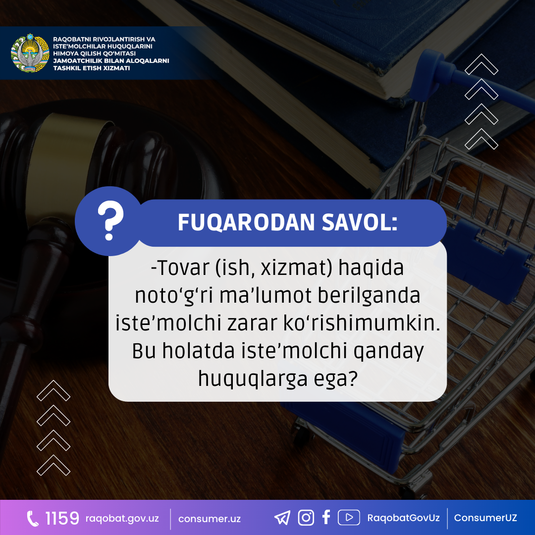 -Tovar (ish, xizmat) haqida noto‘g‘ri ma’lumot berilganda iste’molchi zarar ko‘rishi. Bu holatda iste’molchi qanday huquqlargа ega?