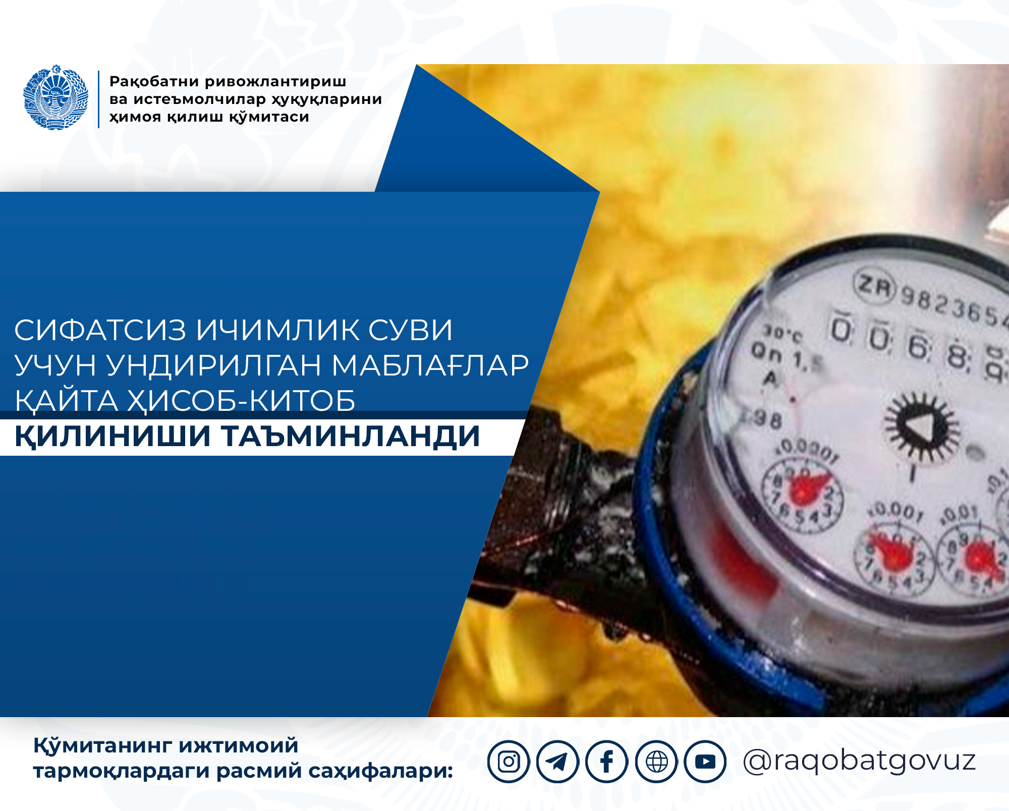 Natijada hududiy boshqarma tomonidan SIRDARYO SUV TA’MINOTI” AJga nisbatan ish qo‘zg‘atilib mablag‘larni qayta hisob-kitob qilish to‘g‘risida bajarilishi majburiy bo‘lgan ko‘rsatma berildi va shu bilan 2 mingdan ortiq istemolchilarning huquqlari tiklanishi ta’minlandi.