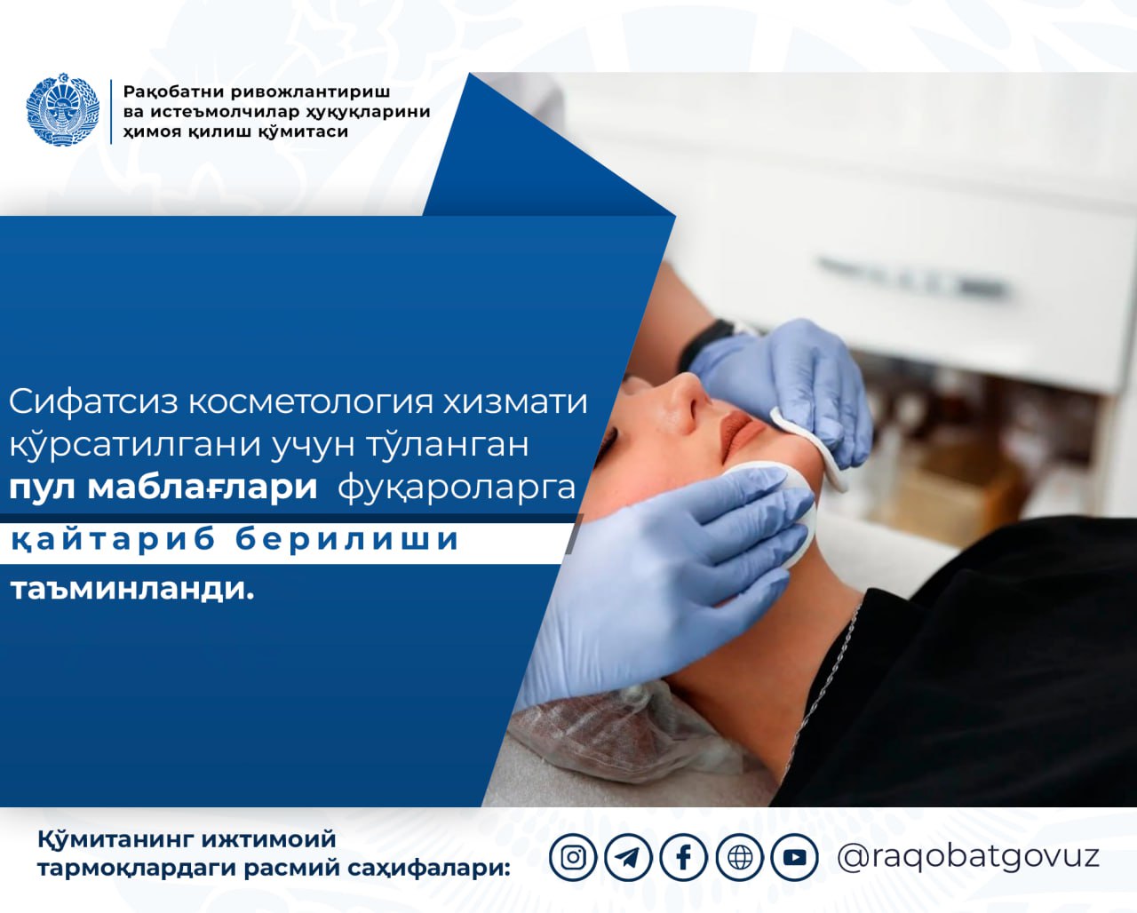 Raqobatni rivojlantirish va iste’molchilar huquqlarini himoya qilish qo‘mitasiga joriy yilning o‘tgan davrida fuqarolardan 320 dan ziyod ariza va shikoyatlar kelib tushgan bo‘lib, unda sifatsiz ko‘rsatilgan xizmatlar orqali sog‘likka to‘g‘ridan-to‘g‘ri zarar yetkazilgani ya’ni terining shikastlangani, to‘qimalarda deformatsiya, shish, yoriqlar, toshmalar kabi asoratlar yuzaga kelgani yuzasidan e’tirozlar bildirilgan.