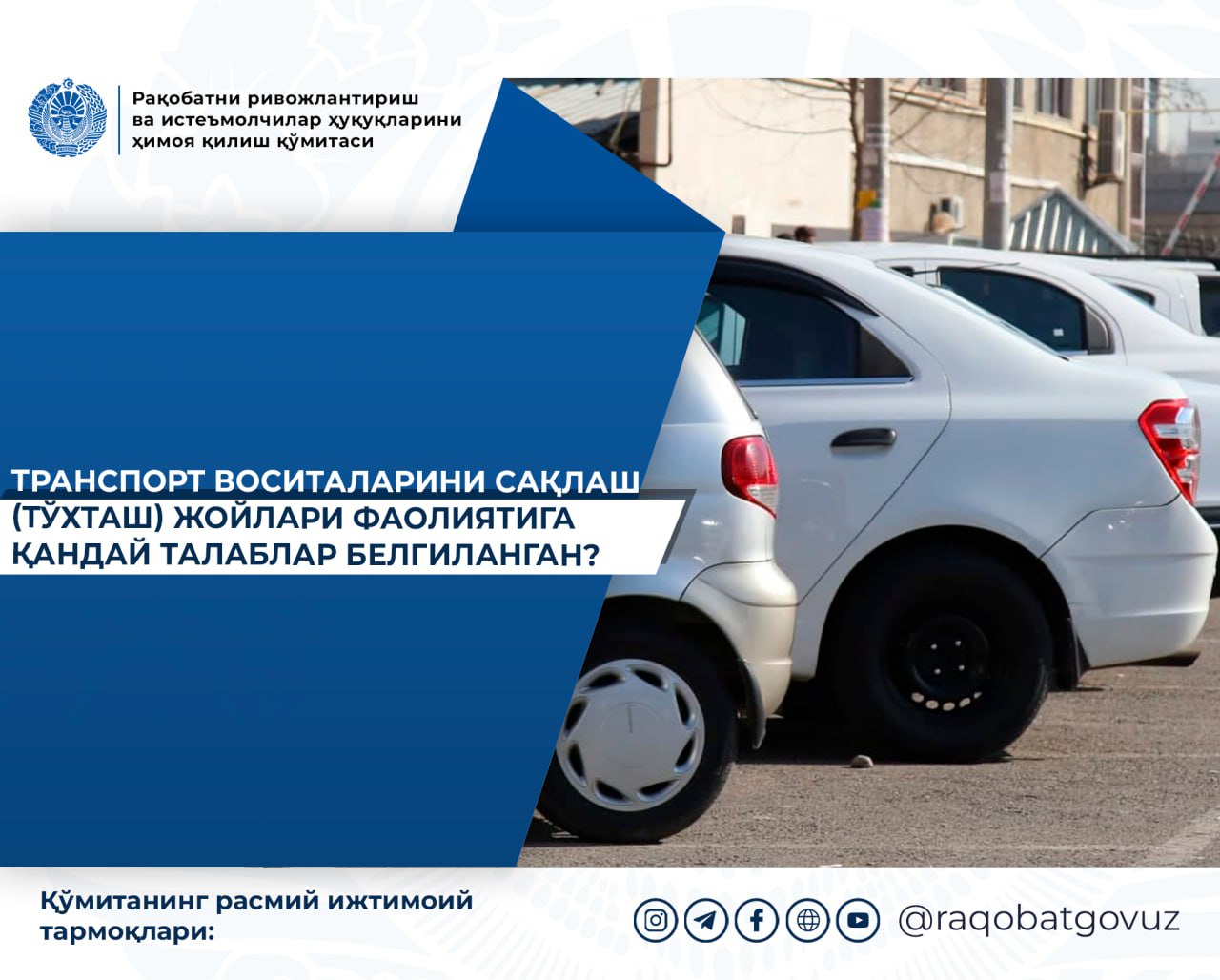 O‘zbekiston Respublikasi Vazirlar Mahkamasining 2013-yil 31-iyuldagi 213-sonli qarori bilan tasdiqlangan “Avtomototransport vositalarini doimiy va vaqtincha saqlash joylarini tashkil etish va ulardan foydalanish tartibi to‘g‘risida”gi Nizomga muvofiq, transport vositalarini saqlash (to‘xtash) uchun to‘lov undirish maxsus ruxsatnoma (litsenziya) asosida amalga oshiriladi hamda belgilangan tariflarga muvofiq bo‘lishi shart.