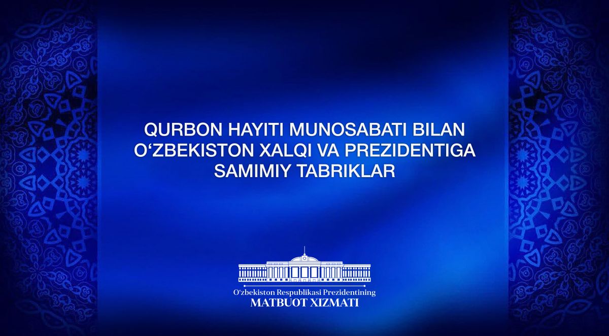 Butun musulmon ummati uchun muqaddas bo‘lgan, ezgulik, saxovat, insonparvarlik va hamjihatlik kabi olijanob qadriyatlarni o‘zida mujassam etgan, jamiyatda o‘zaro hurmat va bag‘rikenglikni mustahkamlashga xizmat qiluvchi Qurbon hayiti – Iyd al-Adho bayrami munosabati bilan O‘zbekiston Respublikasi Prezidenti Shavkat Mirziyoyev nomiga xorijiy davlatlar va hukumatlar yetakchi xalqaro va mintaqaviy tashkilotlar rahbarlaridan, taniqli jamoat va din arboblaridan samimiy tabriklar kelmoqda.