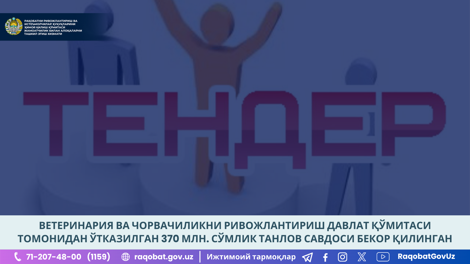 Мурожаатда Ўзбекистон Республикаси Ветеринария ва чорвачиликни ривожлантириш Давлат қўмитаси (кейинги ўринларда – Буюртмачи) томонидан “Бутунжаҳон ҳайвонлар соғлигини ҳимоя қилиш ташкилотини 100 йиллиги”га бағишланган видеоролик ишлаб чиқиш бўйича бошланғич нархи 370,0 млн. сўмлик танловда яшашга яроқсиз жойларни ижарага бериш ва бошқариш фаолияти билан шуғулланадиган корхона ғолиб бўлганлиги кўрсатилган.